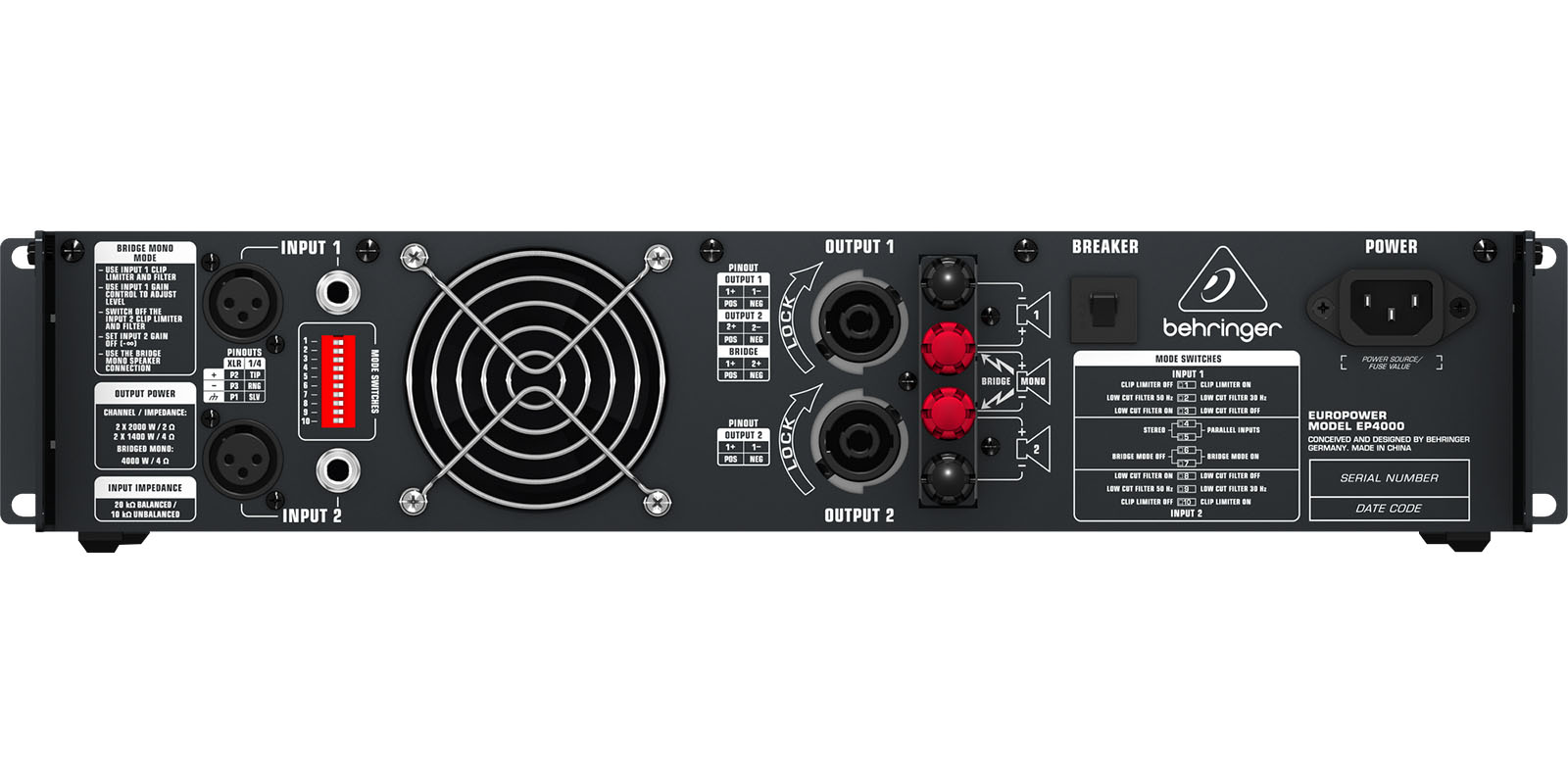 RMS @ 1% THD (onda sinusoidal), ambos canales con señal.8 ohms por canal: 550 watts.4 ohms por canal: 950 watts.2 ohms por canal: 1250 watts.RMS @ 1% THD (onda sinusoidal), mono de puente mono.8 ohms: 1750 watts.4 ohms: 2400 watts.Pico de potencia, ambos canales con señal.8 ohms por canal: 750 watts.4 ohms por canal: 1400 watts.2 ohms por canal: 2,000 watts.Pico de potencia, modo de puente mono.8 ohms: 2,800 watts.4 ohms: 4,000 watts.
