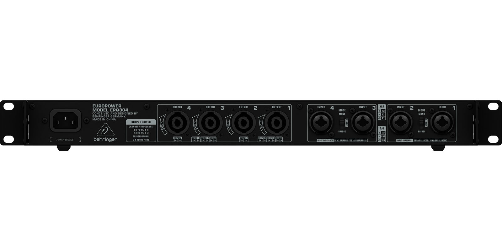Entradas: 4 XLR, TRS 1/4″ combo jacks.Impedancia de entrada: 10 kohms desbalanceado y 20 kohms balanceado.Salidas: 4 conectores profesionales locking-style.Tipo de circuitos de salida: Clase D.Distorsión: 80 a 8 ohms.Relación señal a ruido: >100 dB.