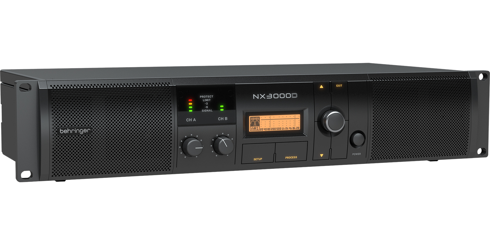 Panel frontal: Power switch, controles de ganancia (canales A y B), sección giratoria DSP push-encoder, botones para Process, Setup, Up/Down, Exit.