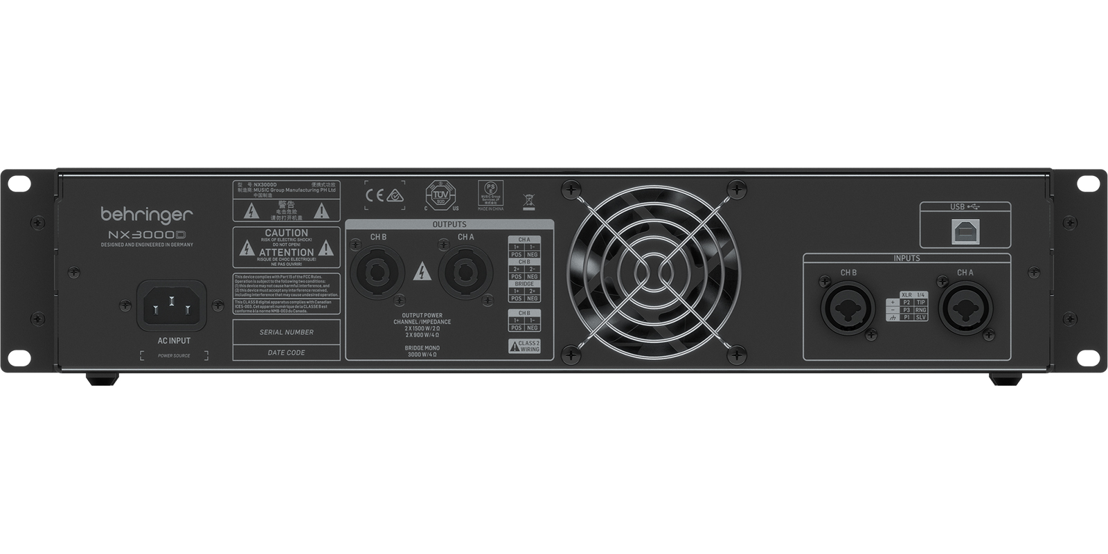 Entradas: 2 jacks combo.Impedancia de entrada: 10 kilo-ohms desbalanceado / 20 kilo-ohms balanceado.Salidas: 2 conectores profesionales de altavoz Locking-Style.Tipo de circuito de salida: Clase D.Distorsión: 145 a 8 ohms.Relación señal a ruido: >100 dB.USB: Conector USB tipo B en panel trasero para control remoto de la sección DSP.
