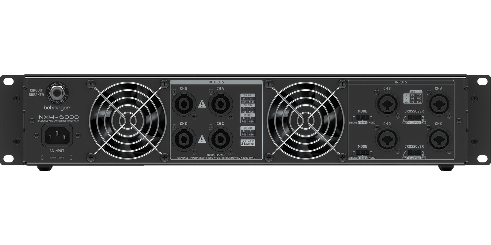 Entradas: 4 jacks combo.Impedancia de entrada: 10 kilo-ohms desbalanceado / 20 kilo-ohms desbalanceado.Salidas: 4 conectores de altavoz locking-style.Tipo de circuito de salida: Clase D.Distorsión: 145 @ 8 ohms.Relación señal a ruido: >100 dB.