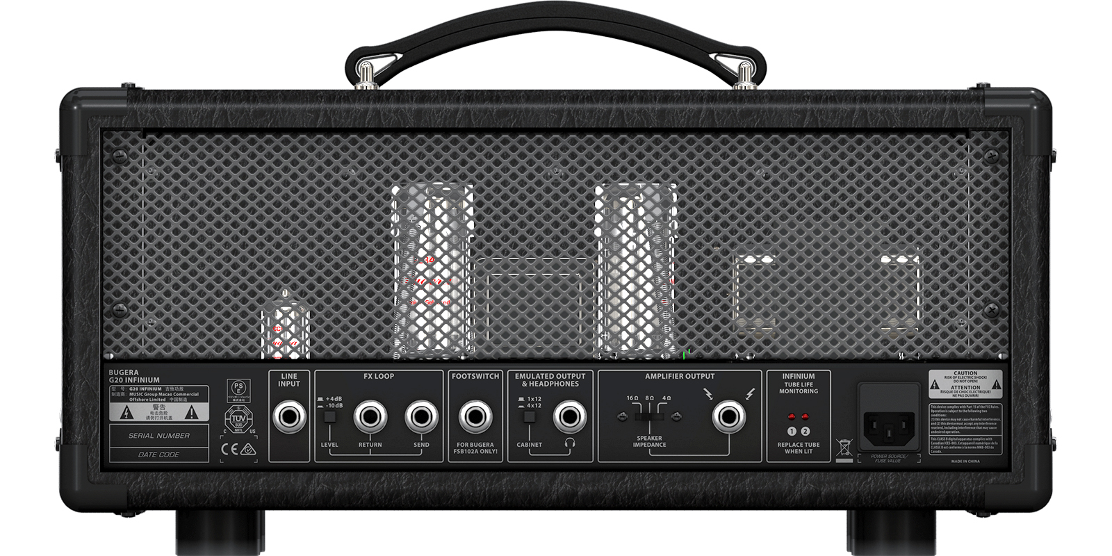 Tipo de bulbo: 2 bulbos EL34.Potencia de salida: 20W.Switch de impedancia: 4, 8 y 16 ohms.Conector de altavoz: TS ¼”.