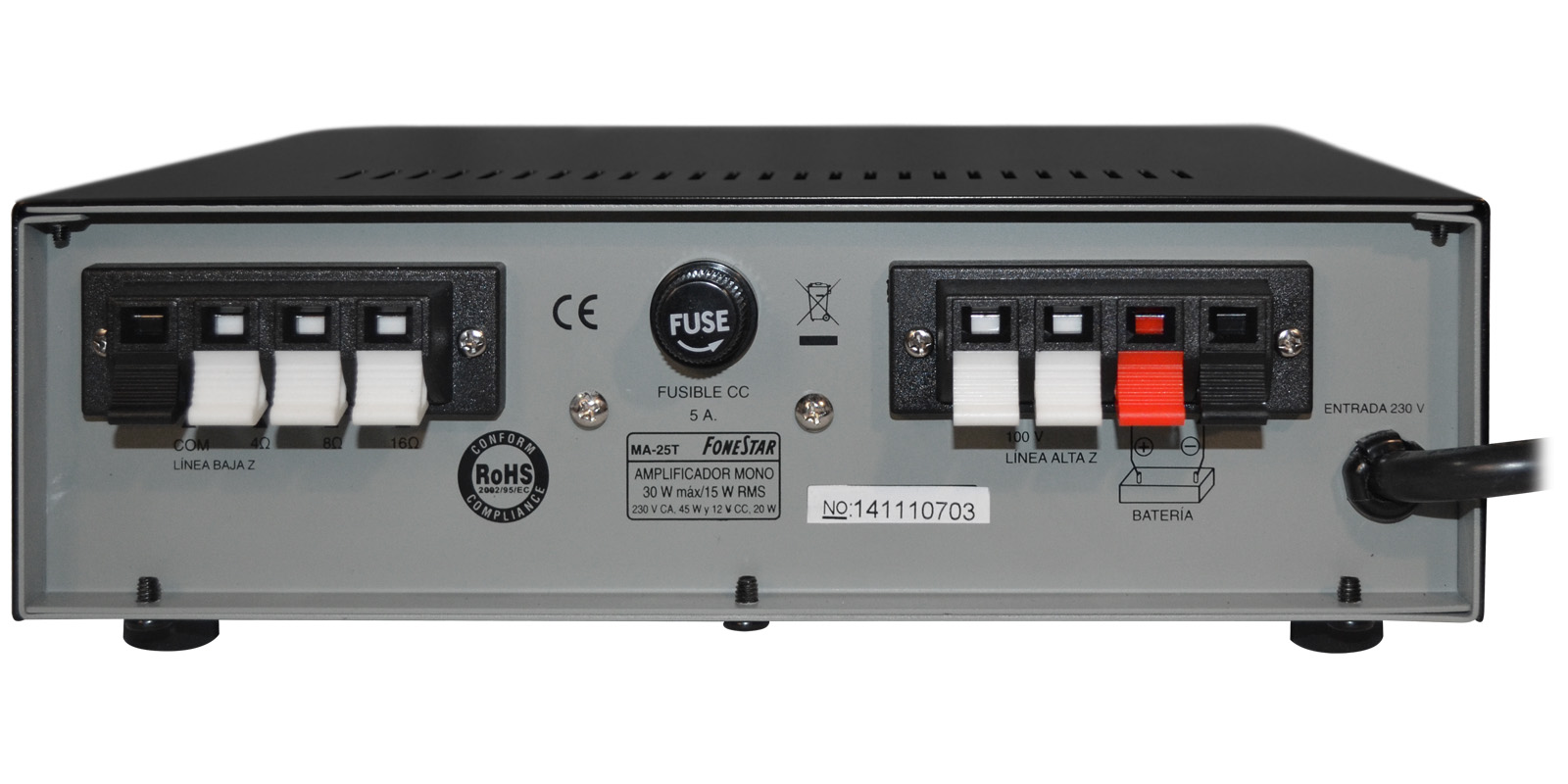 4, 8 y 16 ohms y línea 100 V, terminales a presión.