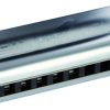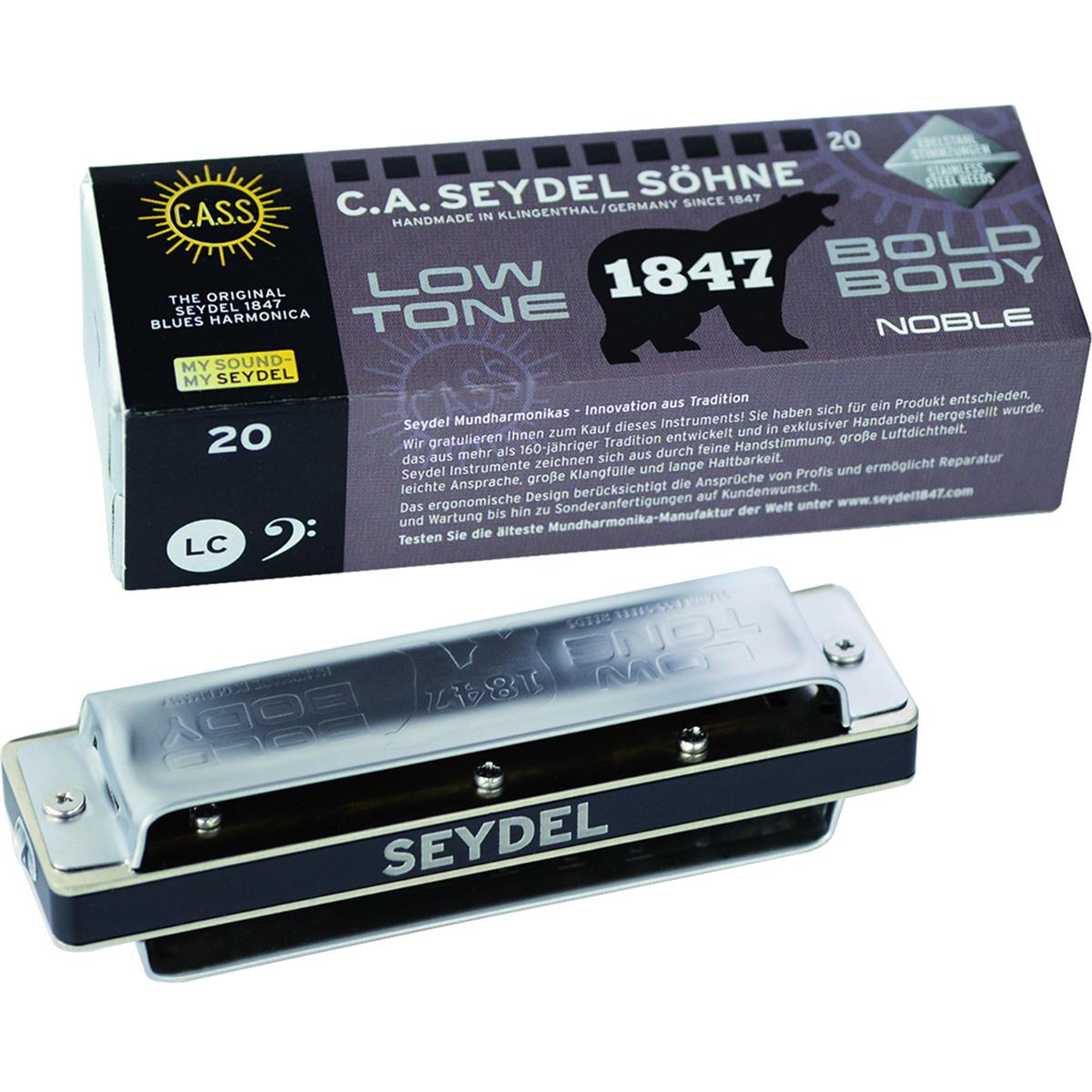 Armónica Blues con cañas de acero inoxidable, cubiertas de acero inoxidable matecon rejillas laterales de ventilación, nueva afinación súper baja, desde LF# (Fa sostenido grave), hasta LLE (E doble grave), proyección optimizada del sonido,distribución del flujo de aire, placa inferior en forma de cono para las notas(LF a LC), peine con fresado de precisión a partir de aluminio, anodizado en negro, logotipo de Seydel grabado con láser en la parte posterior, lengüetas con corte fino fabricadas con plata alemana y fijadas con tornillos de acero inoxidable, tolerancias extremadamente estrechas entre la ranura y la caña.