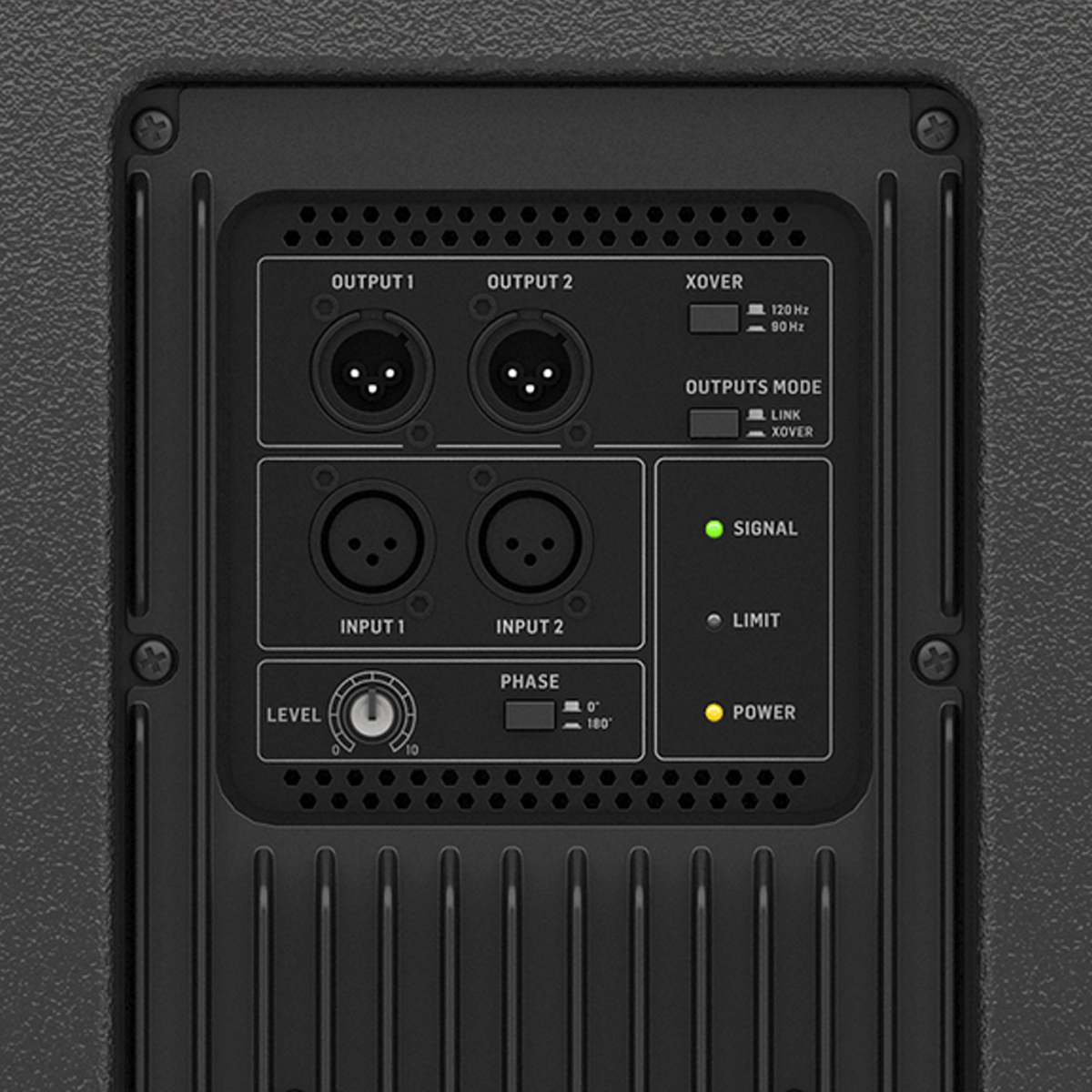 Nivel: infinito a +6 dB, ajustable.Crossover: 90 / 120 Hz, conmutable.Modo de salidas: Link / Crossover conmutable.Fase: 0 / 180°, conmutable.