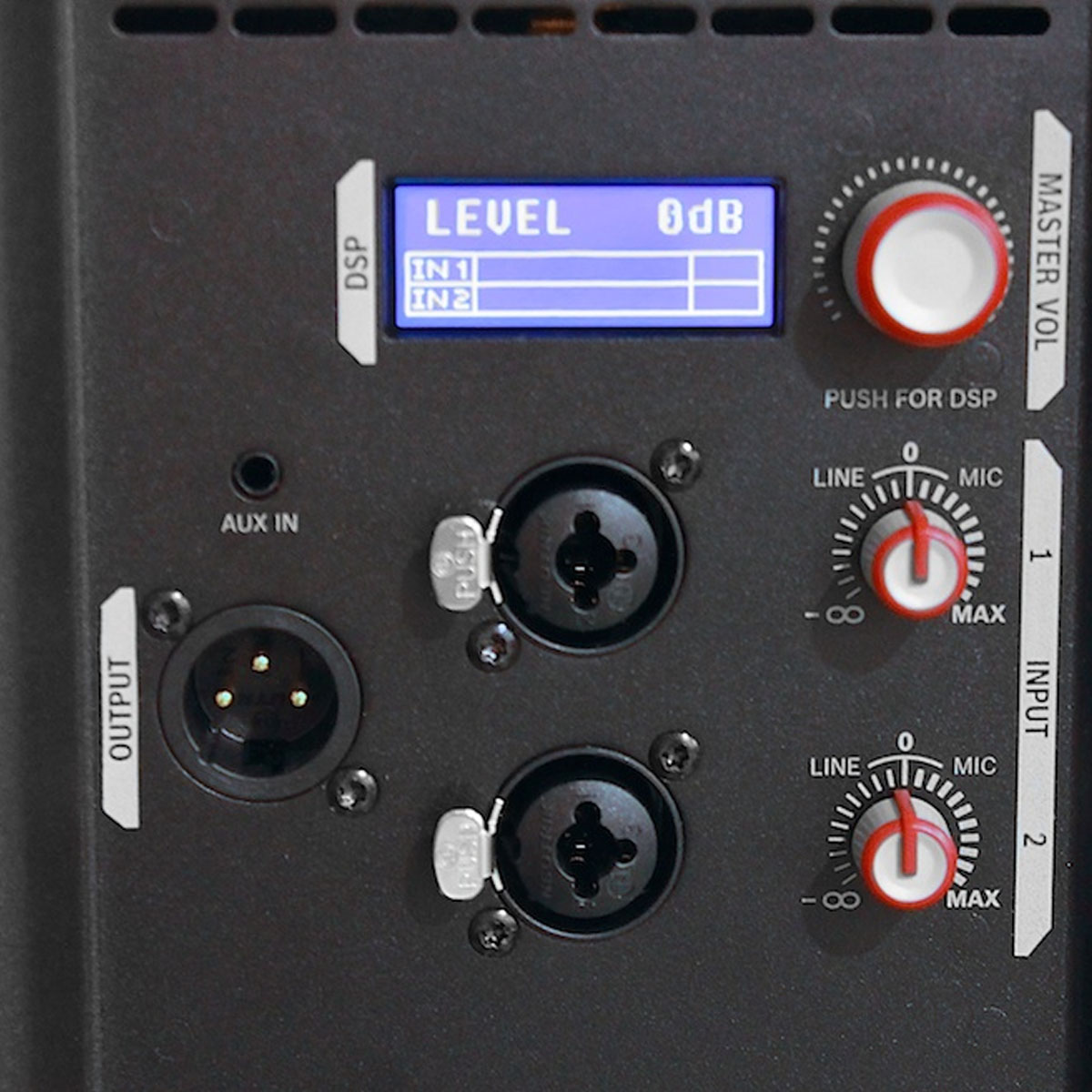 Pantalla de LCD, DSP con presets operado por un solo control, rápidamente optimiza el desempeño del altavoz de acuerdo a tu tipo de ejecución y ubicación del gabinete.