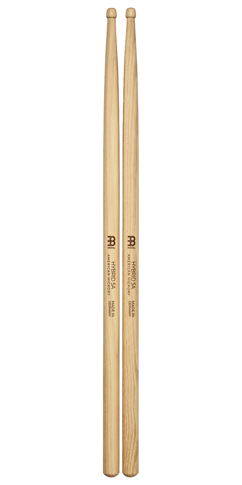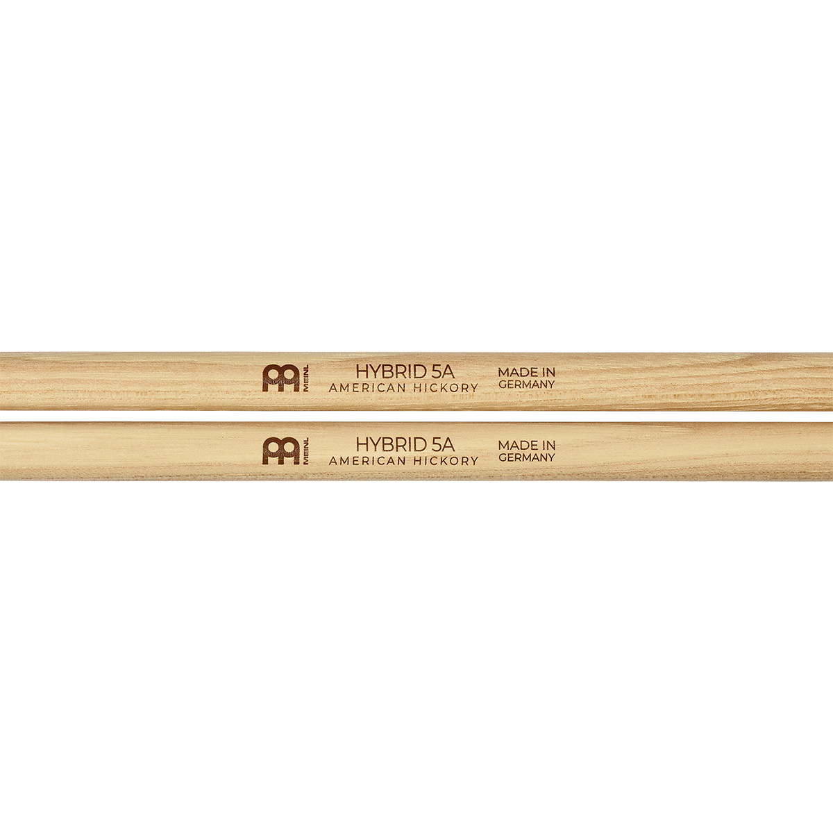 Baquetas 5A, serie Hybrid, punta híbrida, fabricadas con nogal americano, peso y tono a juego, largo: 16.25” pulgadas (41.3 cm), diámetro: 0.565” pulgadas (14.4 mm), longitud cónica larga.