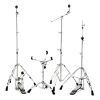Pedal de bombo, atril para hi-hats, atril de tarola, atril de platillo recto y atril de platillo con boom.