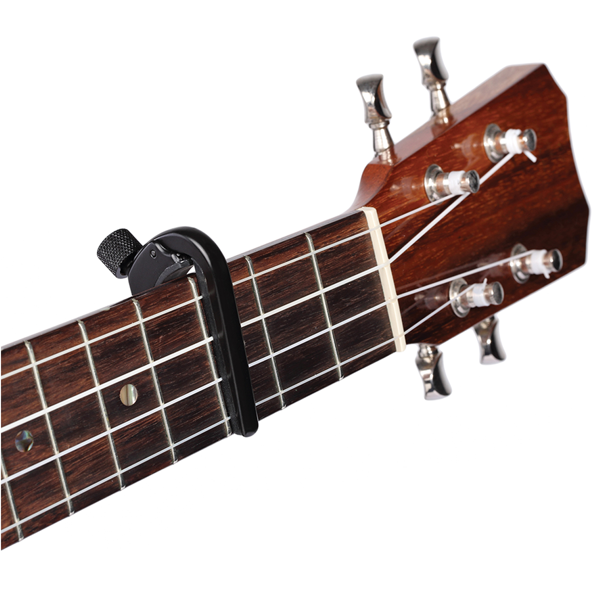 Capodastro diseñado específicamente para ukelele, diseñado para asegurar que tu instrumento esté libre de zumbidos y ofrecer un rendimiento en la afinación al momento de utilizarlo. Un mecanismo de ajuste micrométrico te permite marcar la extensión exacta que se requiere para que las notas suenen claras y sin una fuerza excesiva en cualquier posición sobre el brazo. Esto reduce en gran medida la necesidad de volver a afinar tu ukelele durante y después de utilizar el capo. La construcción en aluminio de calidad aeronáutica elegante puede soportar cualquier daño por el uso excesivo mientras tocas o vas de gira.