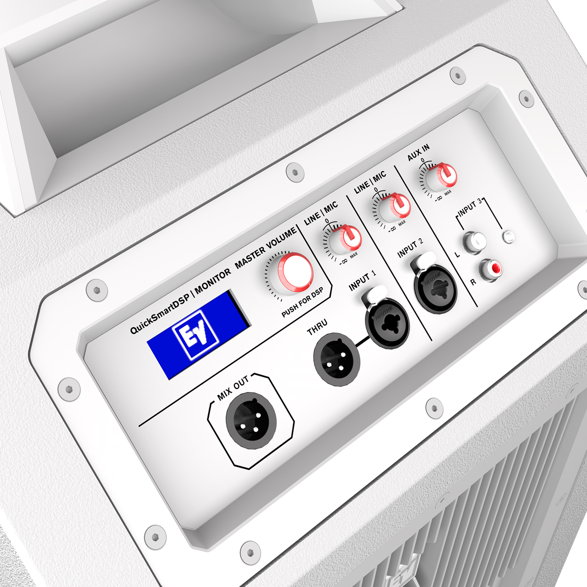 El mejor procesamiento de su clase a través de la exclusiva interfaz de usuario de un sólo botón de EV con LCD. Fácil operación a través de cuatro preajustes (Música, En vivo, Voz, Club), ecualizador de tres bandas, cinco preajustes programables por el usuario, delay de salida, alimentación phantom, control y medición de nivel de entrada y control de volumen master para optimizar la estructura de ganancia.