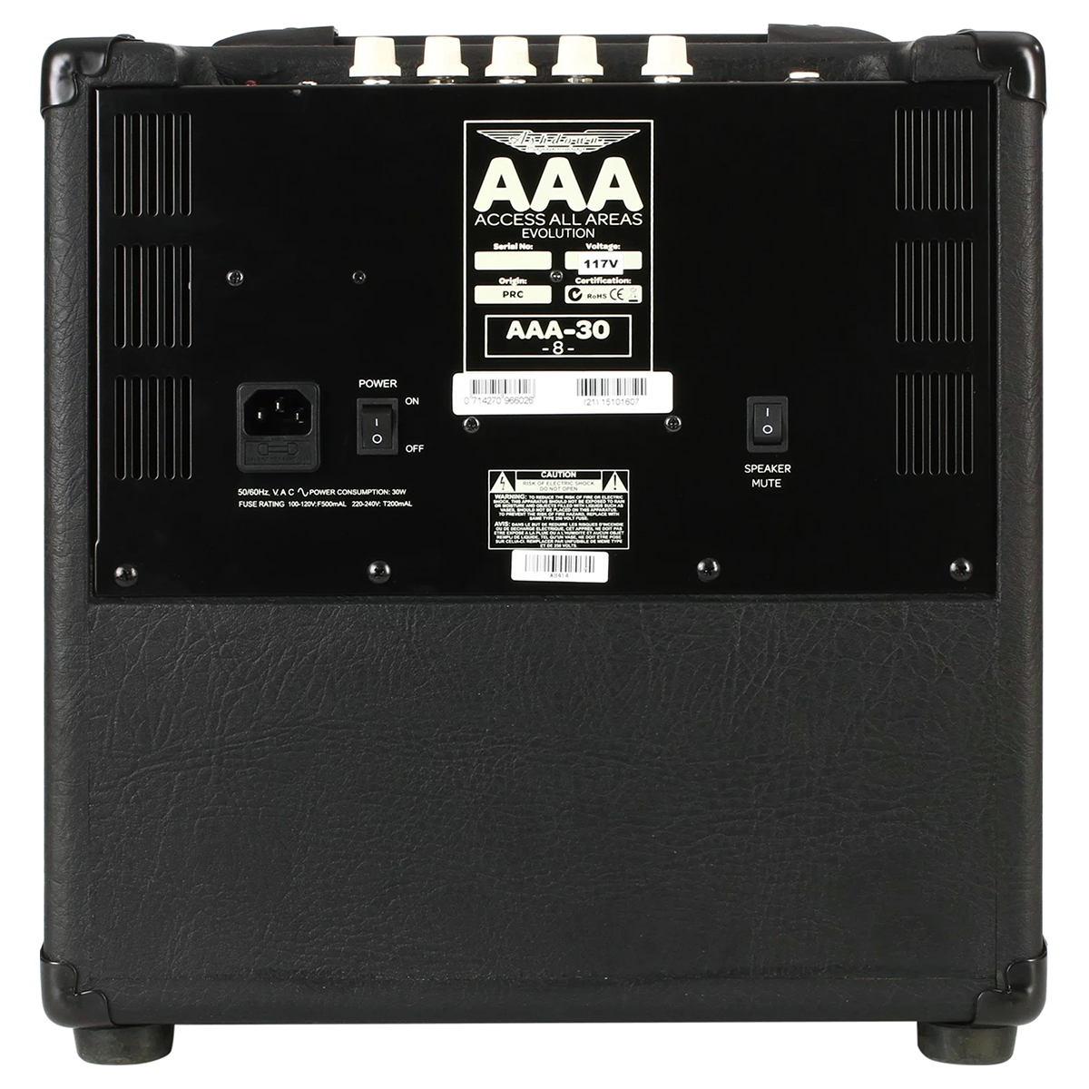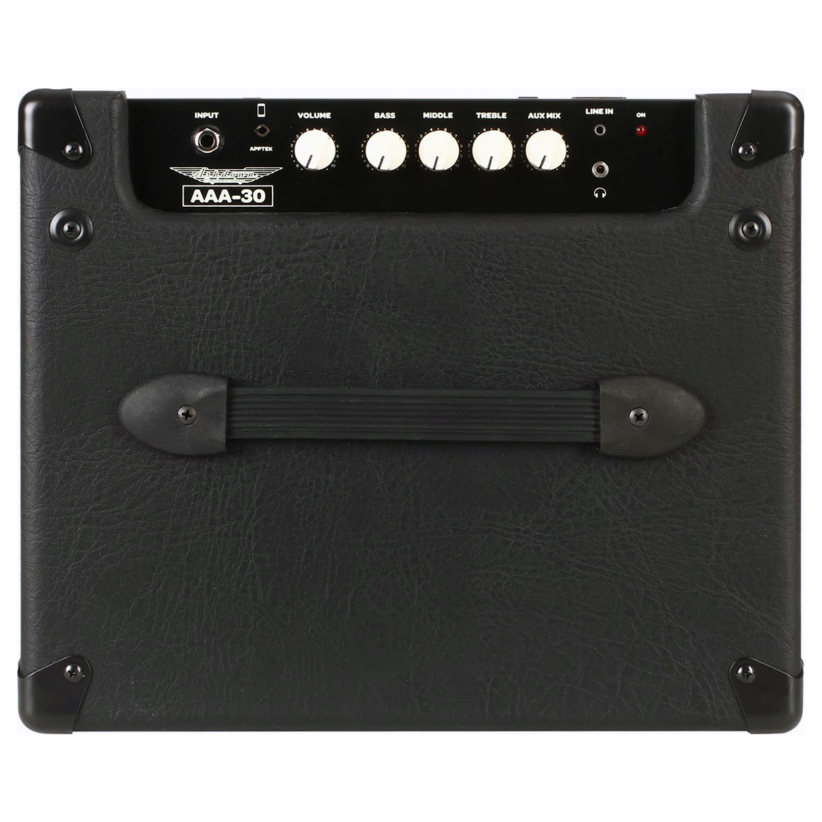 Combo para bajo, potencia de 30 watts, un altavoz de 8” pulgadas, ecualizador de 3 bandas, salida de audífonos, entrada de línea (jack 1/8”), entrada AppTek para conectar tu dispositivo simulador de amplificador en un iPhone o Ipad, dimensiones: 360 x 360 x 300 mm, peso: 10 kg.