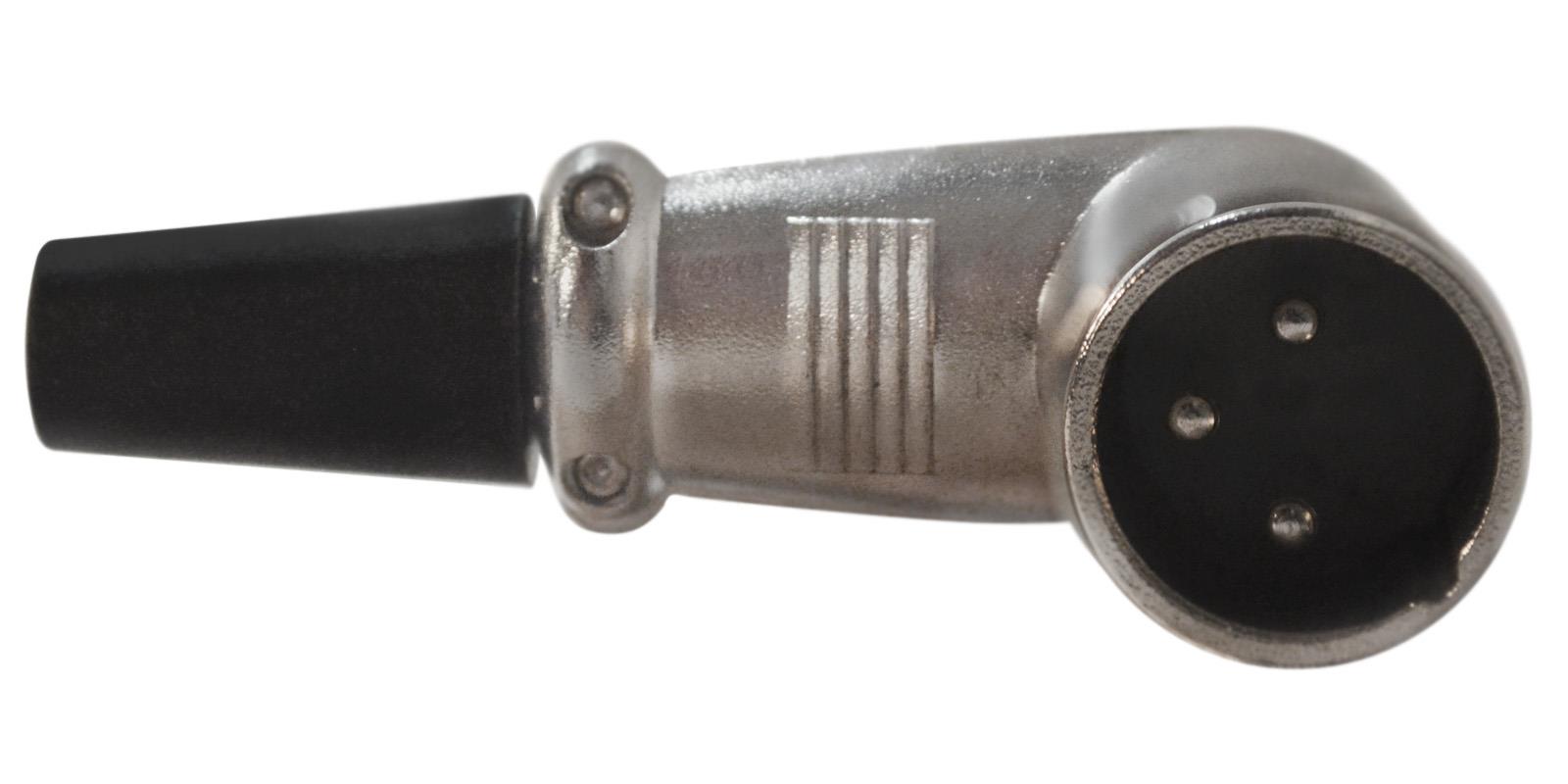 Conector XLR macho angulado de 3 pines con carcasa de níquel plata y pasacablesflexible de PVC.