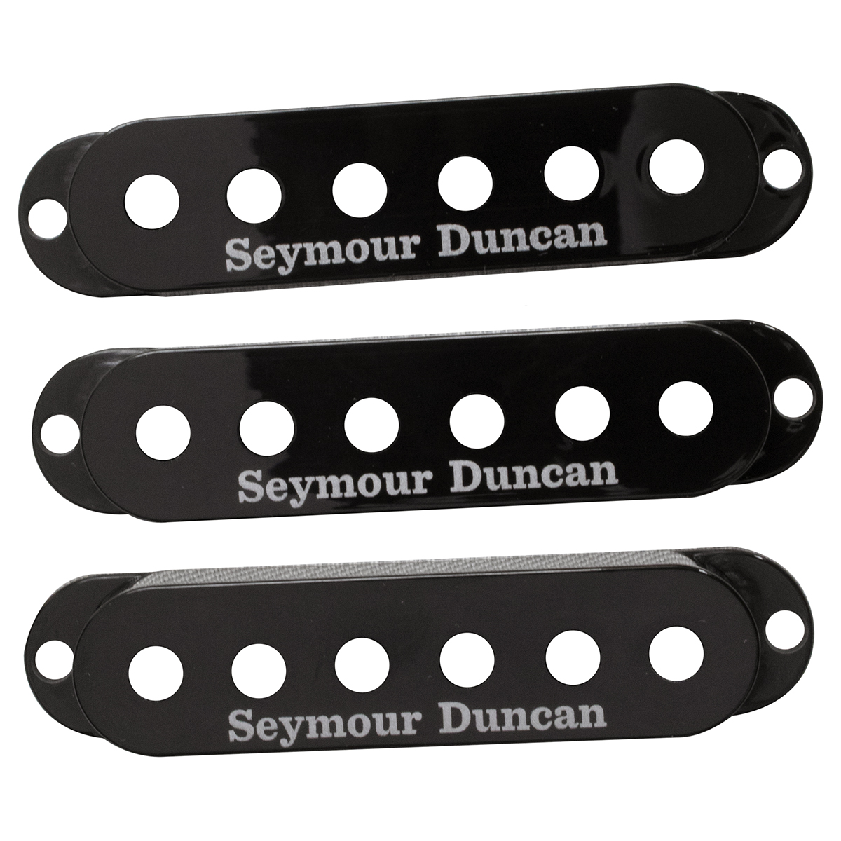 Nuestras cubiertas para pastillas Strat están diseñadas para tener exactamente las mismas dimensiones físicas que una cubierta para pastillas Fender American Standard Strat. Se adaptarán a todas nuestras single-coils modelo SSL (con excepción de los modelos Quarter Pound, que son demasiado grandes para una cubierta). Este es un set de 3 cubiertas, con el logotipo de Seymour Duncan. El terminado negro brillante está diseñado para combinar con el color de las cubiertas negras de Fender. El terminado brillante de color crema está diseñado para parecerse a una vieja cubierta de “blanco envejecido”. El acabado brillante de color pergamino blanquecino está diseñado para combinar con el color blanco estándar de Fender.