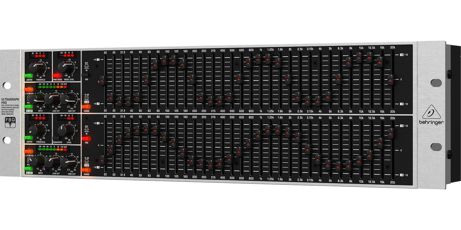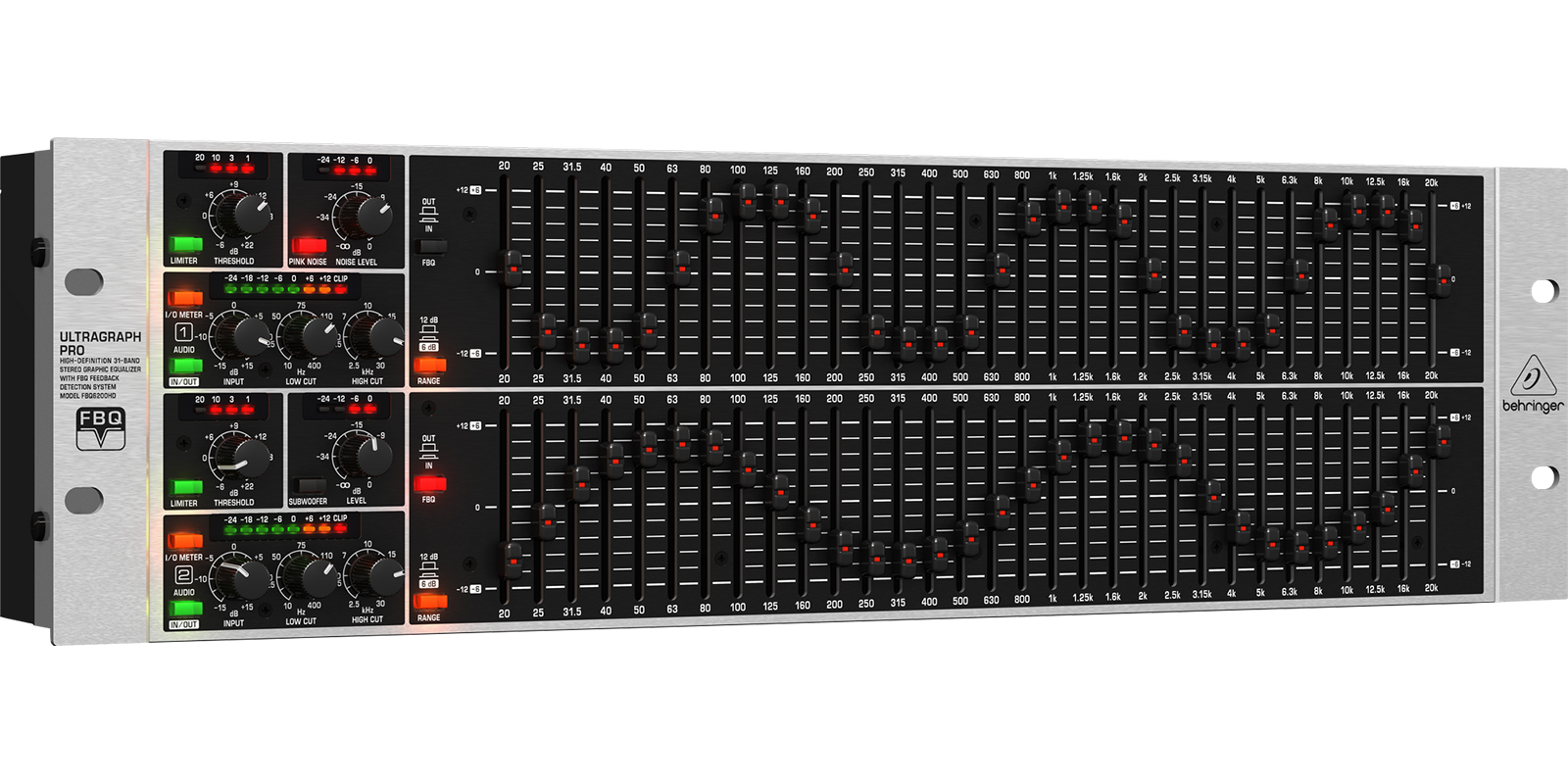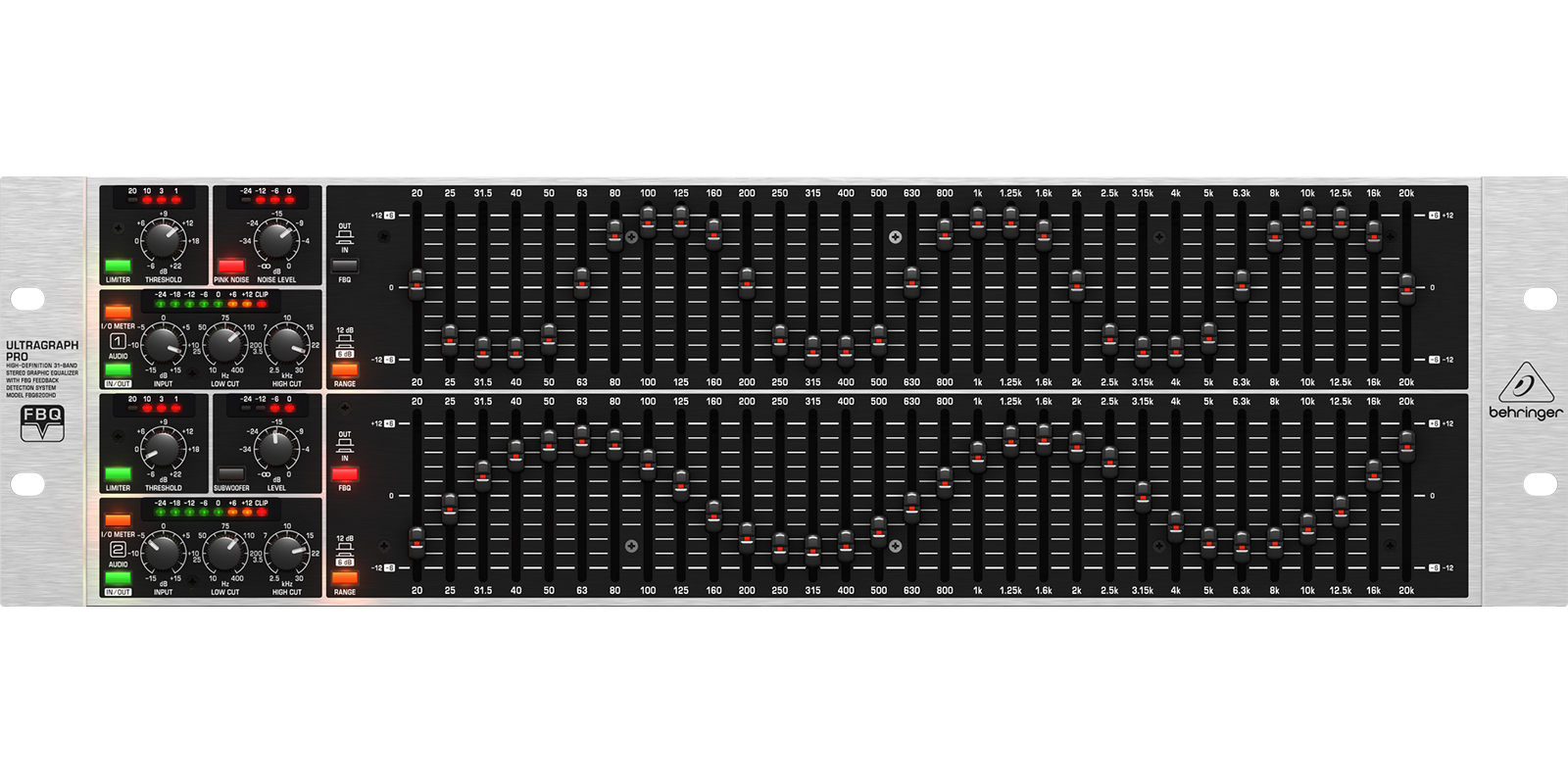 FBQ: Activa el sistema de detección de retroalimentación.Audio In/Out: Cambia a bypass las funciones del ecualizador.I/O Medidor In/Out: Cambia el display medidor de entrada a salida.Rango: Cambia el rango máximo de cut/boost para todas las 31 bandas.Limiter: Activa el limitador.Pink Noise: Activa el generador de ruido rosa.Subwoofer: Activa la salida de subwoofer.