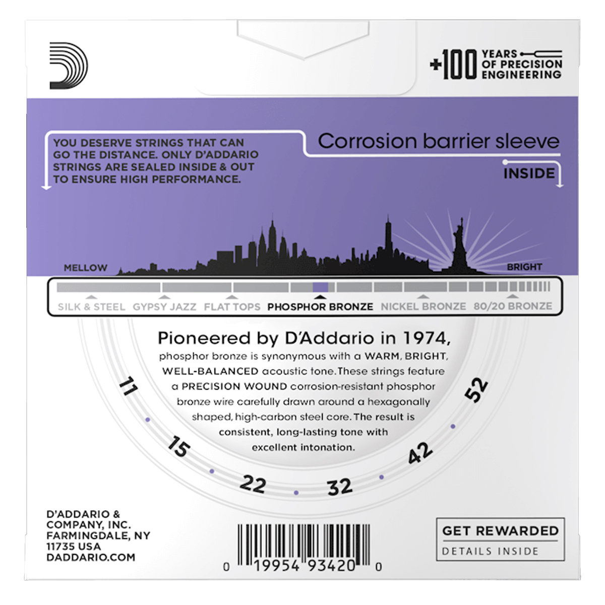 El bronce fosforado proporciona un sonido más cálido pero brillante además de gran duración por sus propiedades resistente. Las cuerdas D’Addario son entorchadas a la perfección garantizando un sonido potente y estable además de una afinación duradera.