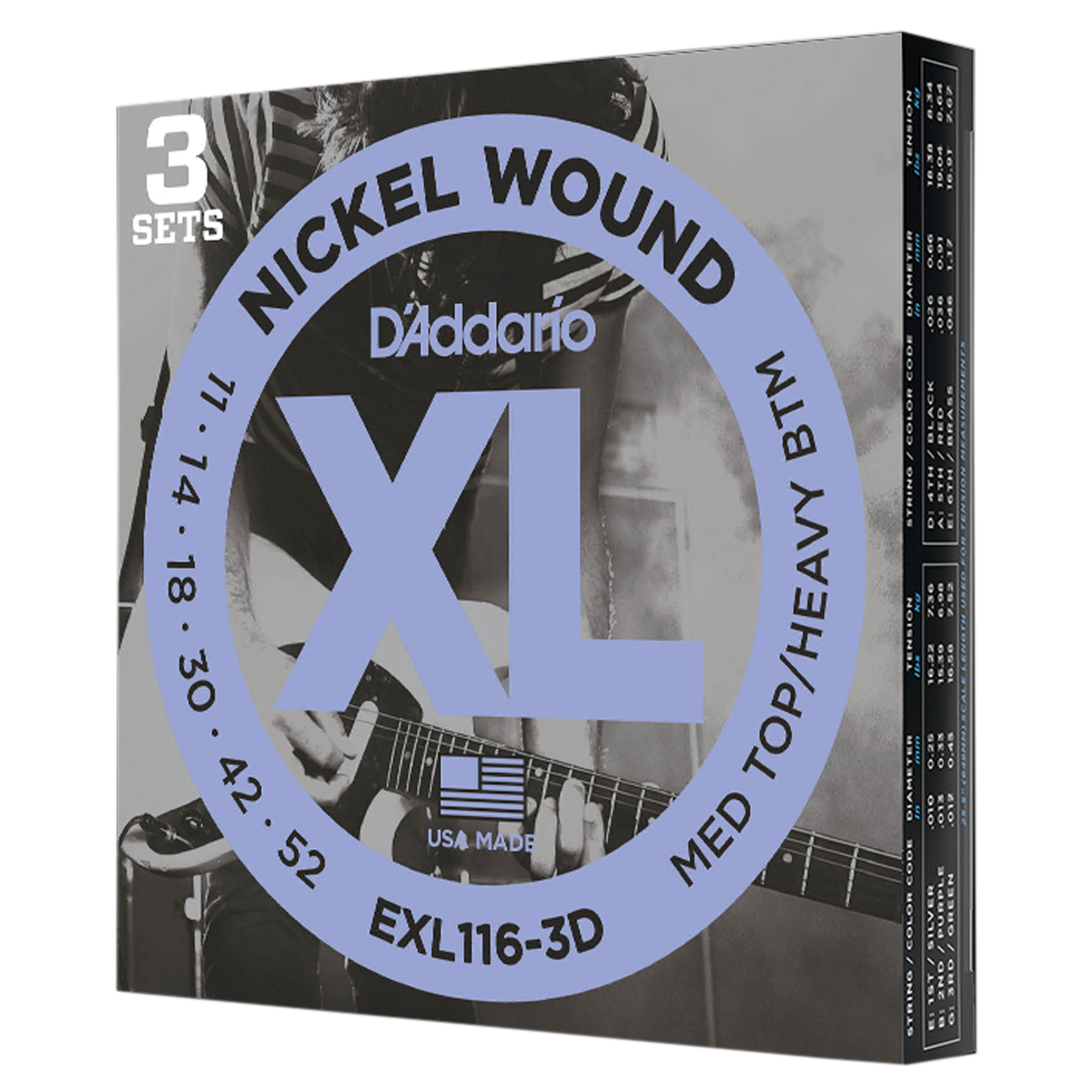 Cuerdas para guitarra eléctrica de parte superior media/inferior pesada, paquete de 3 con alambre envolvente de acero niquelado y fabricadas con nuestro Hex-Core patentado. Las cuerdas para guitarra eléctrica XL Nickel se fabrican en los EE. UU. y se elaboran según nuestras estrictas especificaciones en nuestras instalaciones de producción de Nueva York.