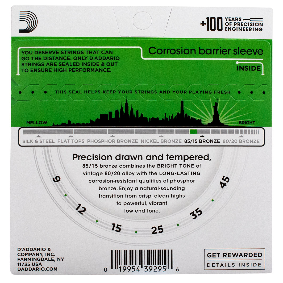 Juego de cuerdas para guitarra acústica, bronce 85/15, tensión media blanda, 09-45, calibre híbrido original de D’Addario, para rasgueo intenso, combina el brillo del bronce 80/20 con las características de mayor durabilidad del bronce fosforado, entorchado con precisión sobre un núcleo de acero de alto carbono con forma hexagonal y estirado, excelente entonación, tono acústico brillante, proyección y facilidad de uso, ideal para todos los estilos musicales, paquete ecológico y resistente a la corrosión.
