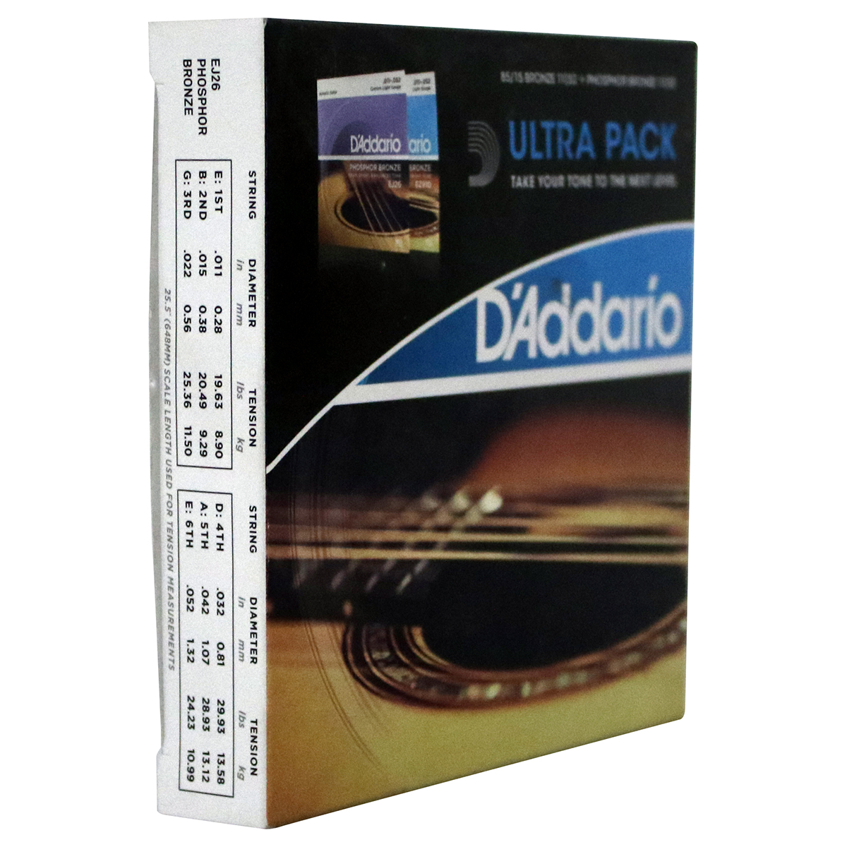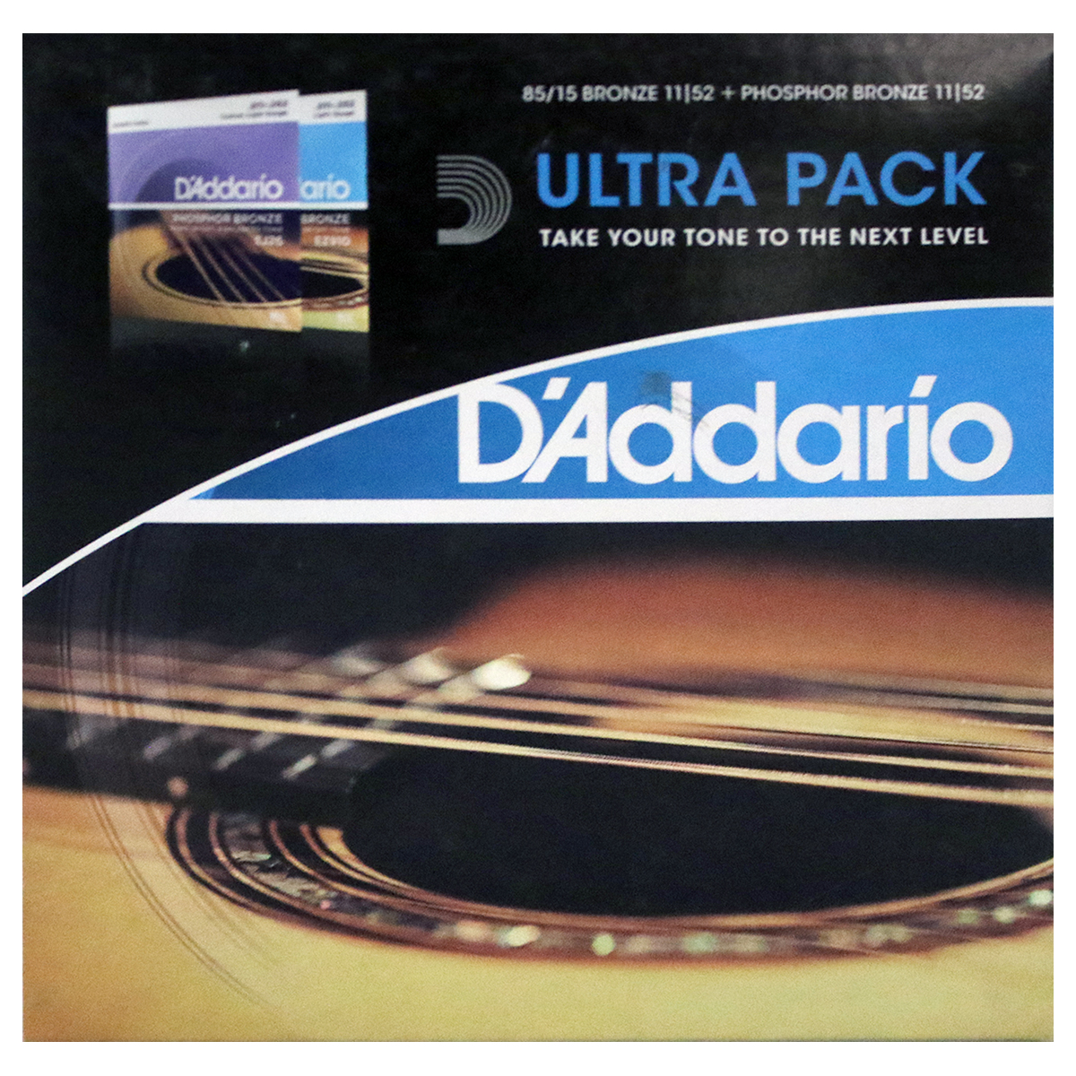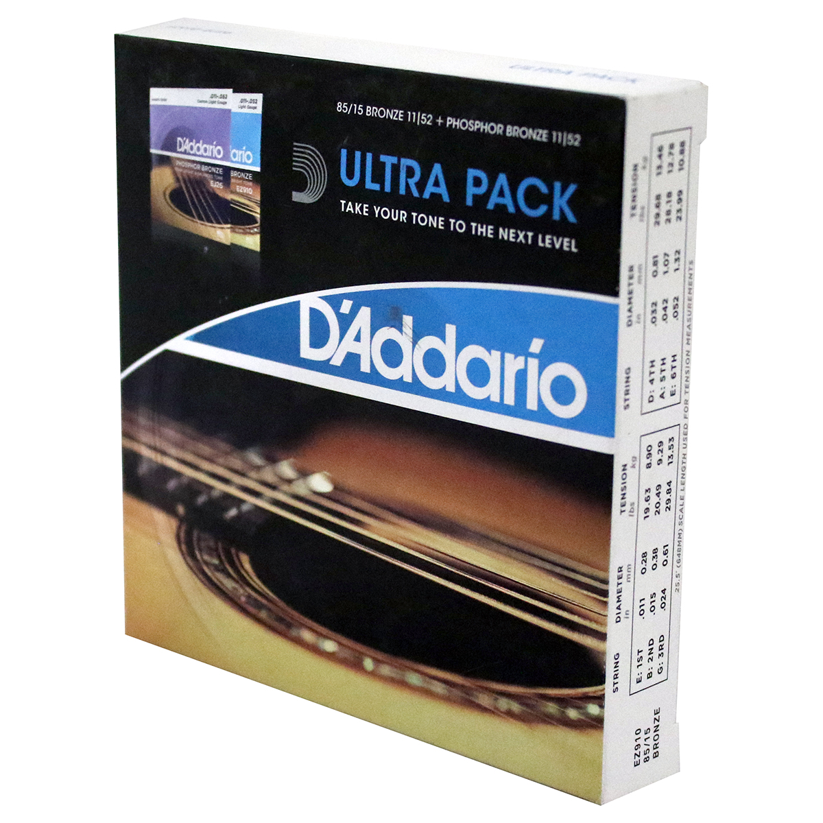 Entorchado de bronce 85/15: Esta aleación del material de entorchado consiste en 85% cobre y 15% estaño, lo que les da un sonido brillante pero profundo y un gran tacto al tocar, además de gran versatilidad. Con su tecnología de vanguardia, las cuerdas D’Addario son entorchadas a la perfección garantizando un sonido potente y estable además de una afinación duradera.Núcleo hexagonal de acero al alto carbón: Este material ofrece además de alta resistencia y durabilidad, un sonido cristalino con mucha proyección, sustain y gran conservación de la afinación.Tensión extra ligera: Ideal para principiantes o músicos que gustan de hacer bendings y un sonido más suave.Paquete ecológico y resistente a la corrosión para conservar la frescura de las cuerdas.Fabricadas en USA.Calibres: Acero liso .011, .015 y Entorchado en bronce .024, .032, .042, .052.