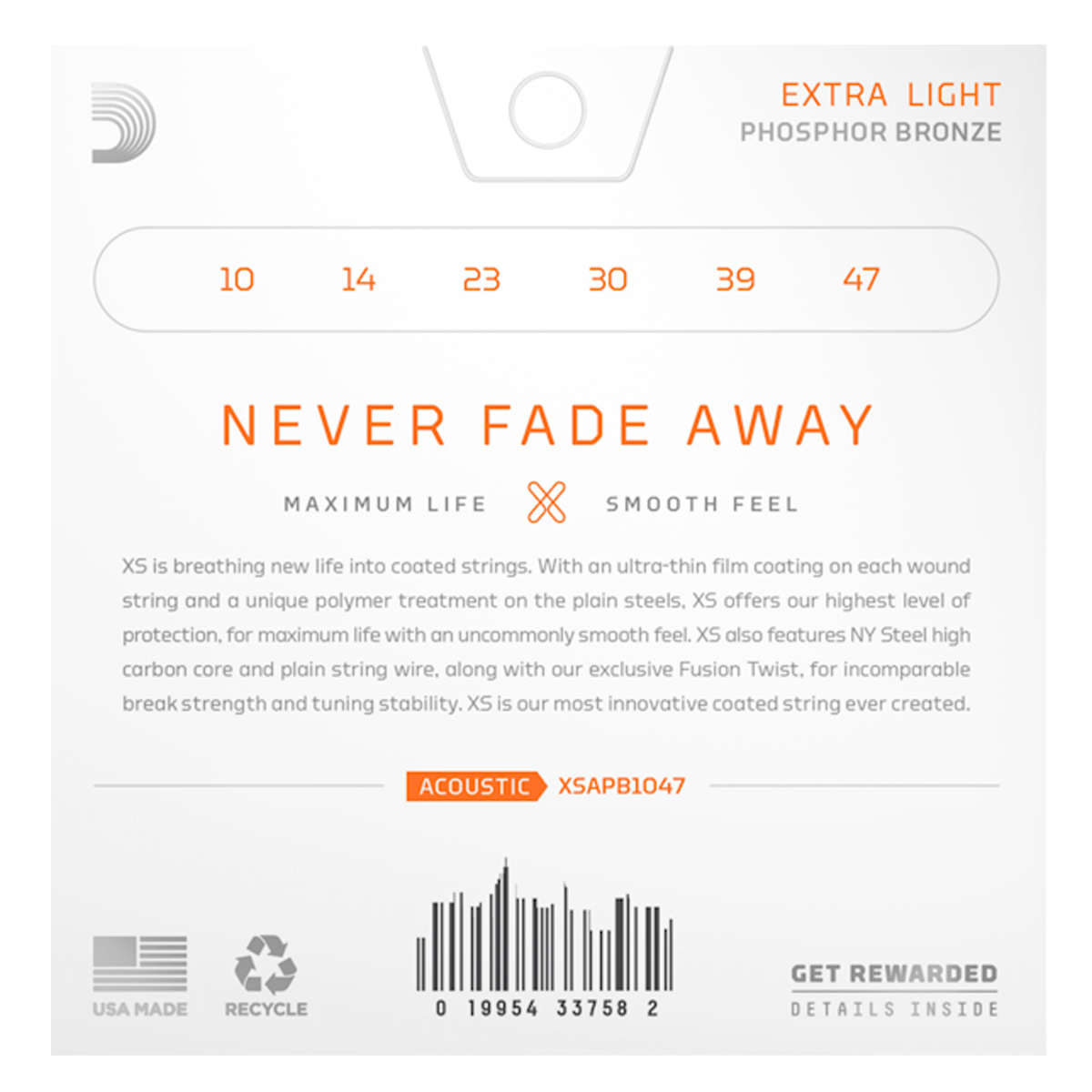 Juego de 3 cuerdas para guitarra acústica con revestimiento extra ligero con revestimiento de película XS ultrafino y alambre envolvente de bronce fosforado y un núcleo de NY Steel y tecnología Fusion Twist, XS Phosphor Bronze ofrece mayor resistencia a la rotura y una estabilidad de afinación inigualable, manteniéndose afinado un 131% mejor que las cuerdas acústicas estándar.