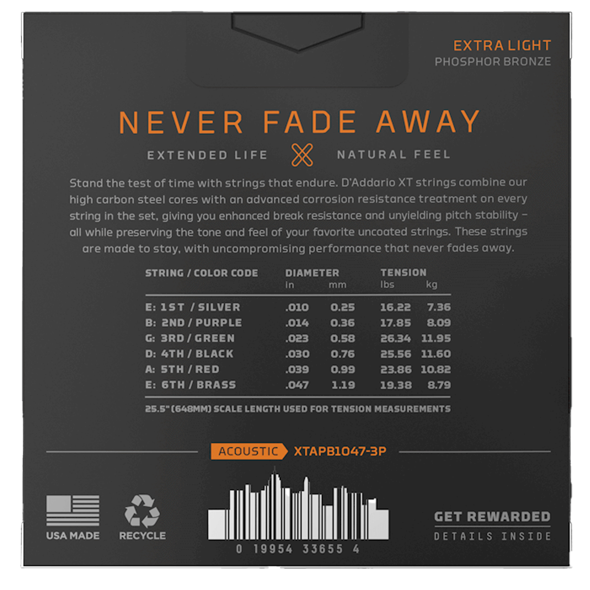 Juego de 3 cuerdas para guitarra acústica con revestimiento extra ligero y revestimiento avanzado resistente a la corrosión, alambre envolvente de bronce fosforado y núcleo de NY Steel y tecnología Fusion Twist. Estas cuerdas se fabrican en los EE. UU. y se elaboran según nuestras estrictas especificaciones en nuestras instalaciones de producción de Nueva York.