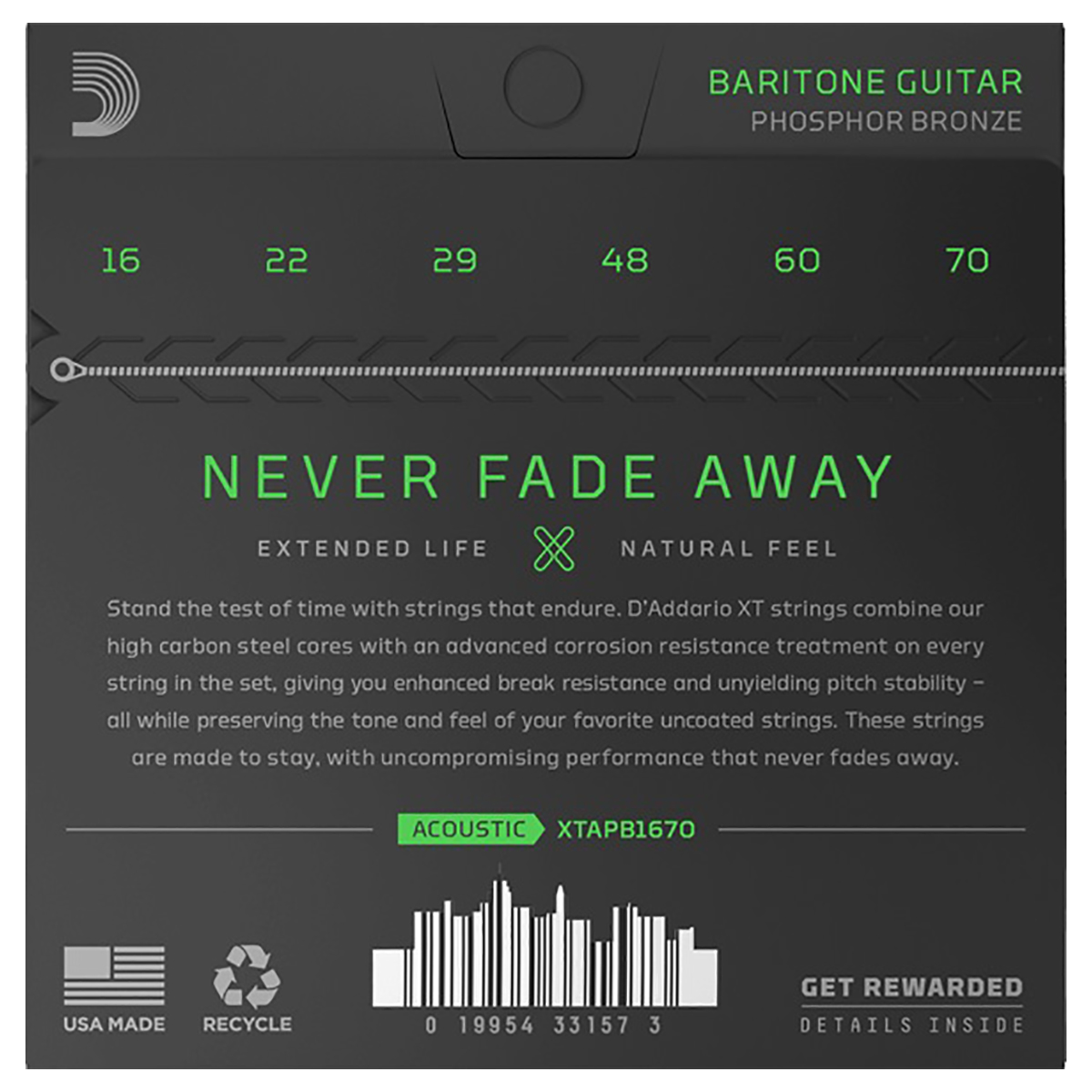 El núcleo hexagonal dibujado con precisión fue pionero de D’Addario. Esta innovación permite que el alambre agarre el núcleo para una estabilidad dimensional superior, durabilidad mejorada y entonación precisa.