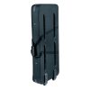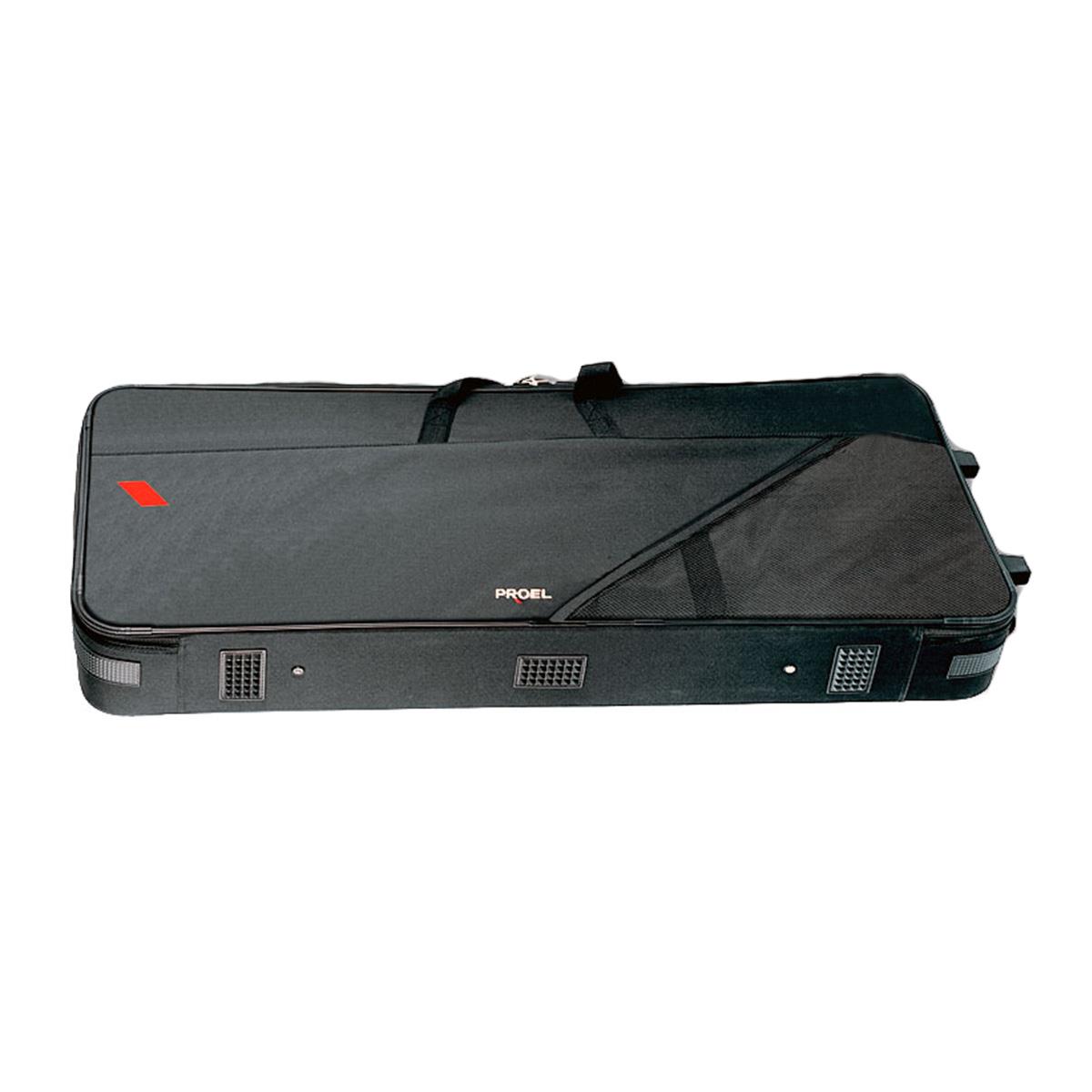 Bolsillos para accesorios y bolsa para cable. Manijas de tela acolchada. Ruedas de nylon de alta resistencia. Mango de metal con resorte.