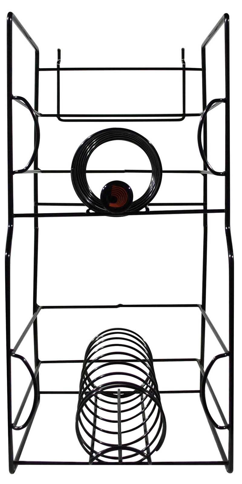 Exhibidor dispensador para encordaduras de bajo eléctrico, fabricado con alambre de acero, con resorte metálico y logotipo en plástico, 2 niveles, ideal para slatwall o mostrador, dimensiones: 28 x 13 x 17.5 cm