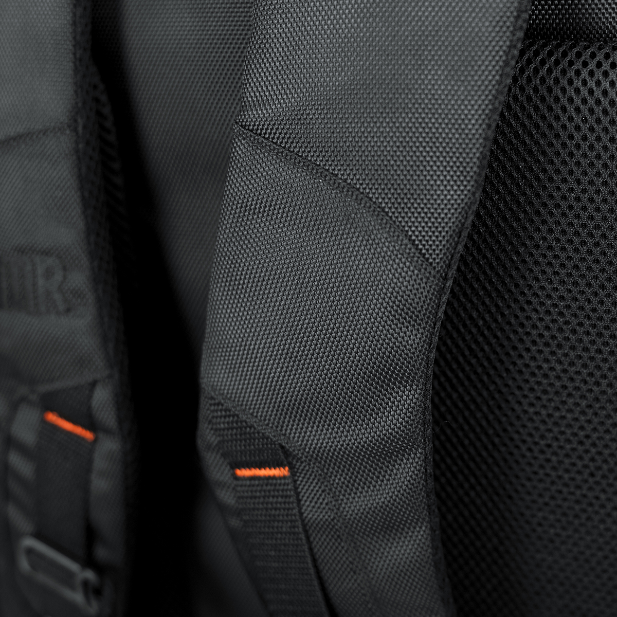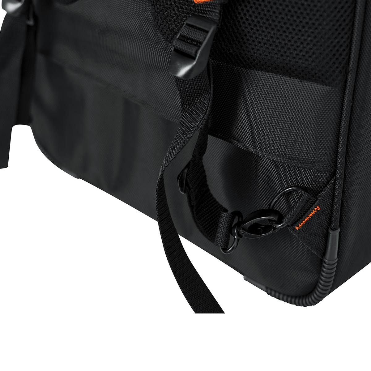 - Exterior de nylon resistente en negro con detalles en naranja.