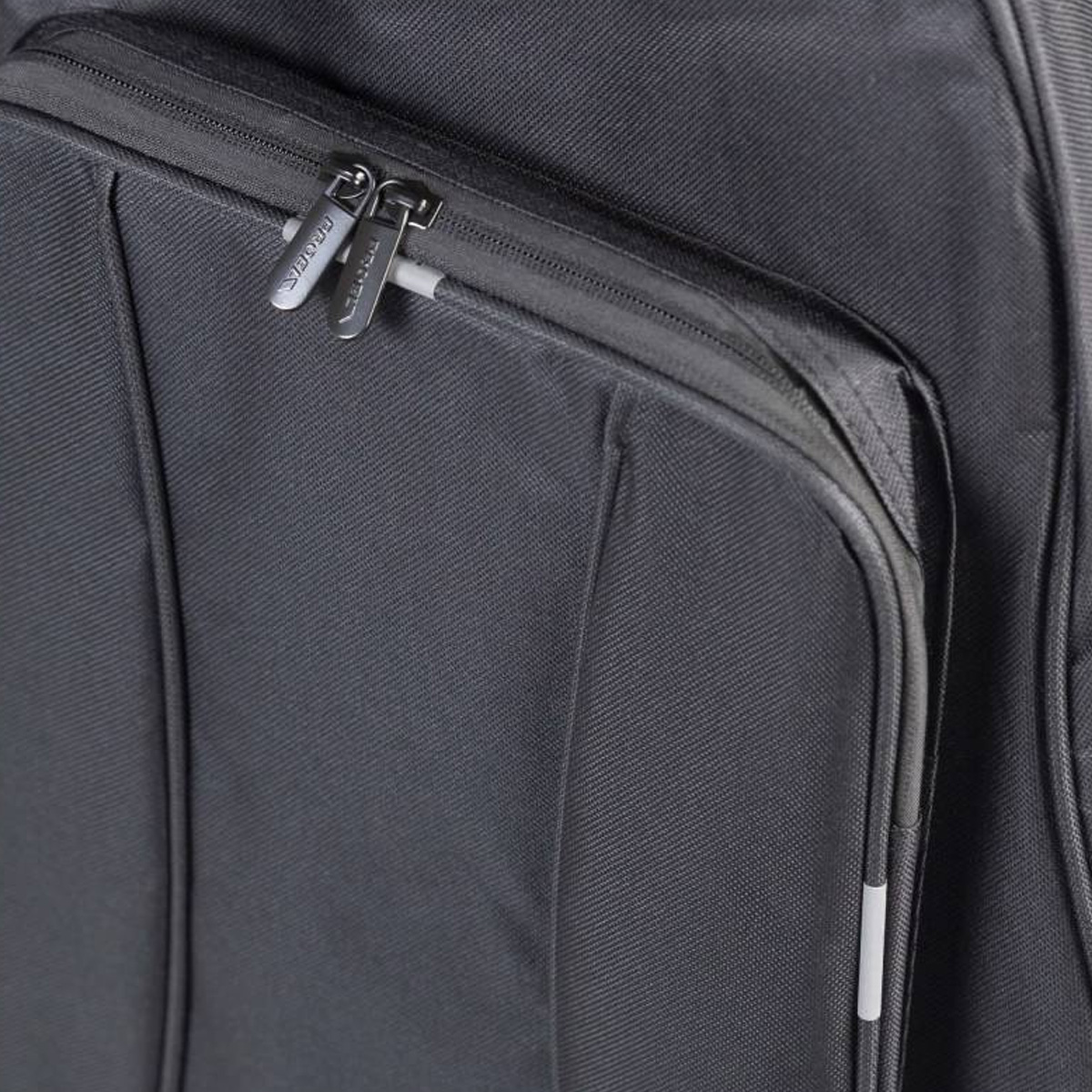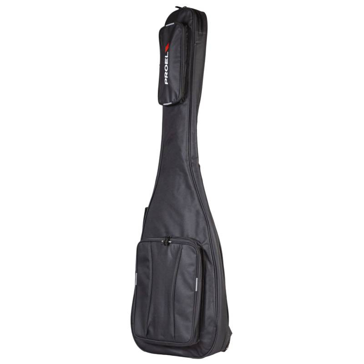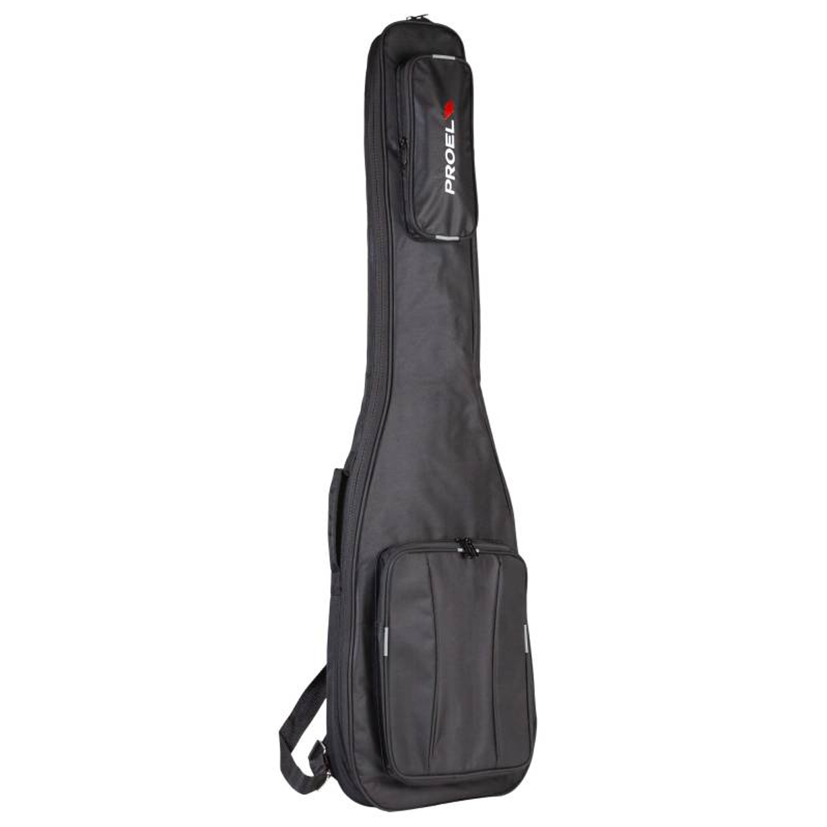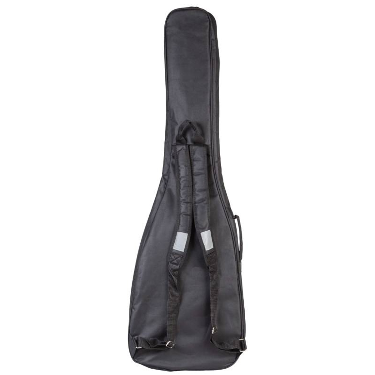 Funda para bajo eléctrico de Poliéster 600D acolchado a prueba de desgarros de 10 mm de poliuretano de alta densidad y forro de nylon 90D con inserción reforzada en color Negro. Práctica asa lateral para el transporte y correas acolchadas ajustables para los hombros con ojales metálicos e inserciones reflectantes, bolsillo superior para accesorios, bolsillo frontal amplio para partituras y accesorios y cremalleras duraderas con tirador de metal fundido.
