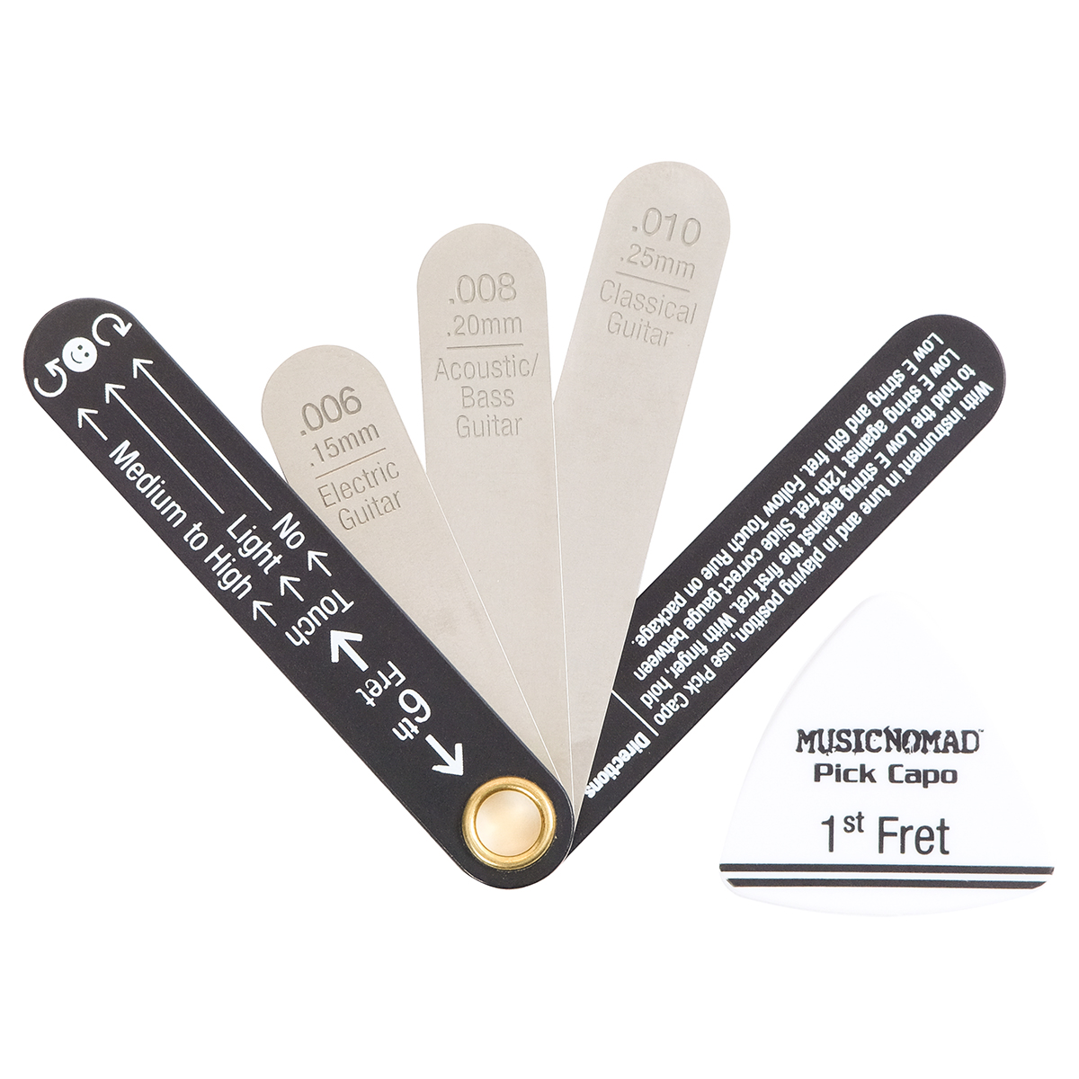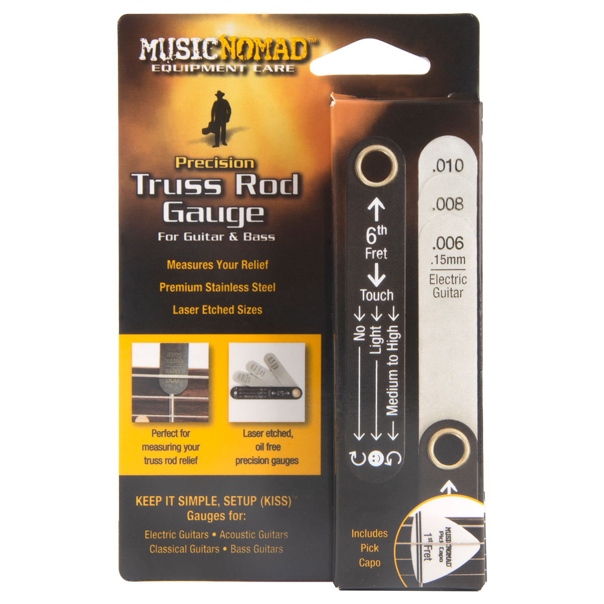 Juego de galgas que incluyen 3 medidas de relieve (.006”, .008”, .010”) para guitarra eléctrica, acústica, clásica y bajo, fabricada con acero inoxidable, alta precisión, sin el molesto y sucio aceite que se encuentra en los juegos de galgas tradicionales, tamaños grabados con láser (pulgadas y milímetros) y tipo de instrumento que no se desprende, instrucciones fáciles de seguir impresas en el mango y una innovadora cejilla para ayudar, este medidor es parte de nuestro método KKEP IT SIMPLE SETUP (KISS) utilizando nuestros juegos de herramientas y medidores de precisión.