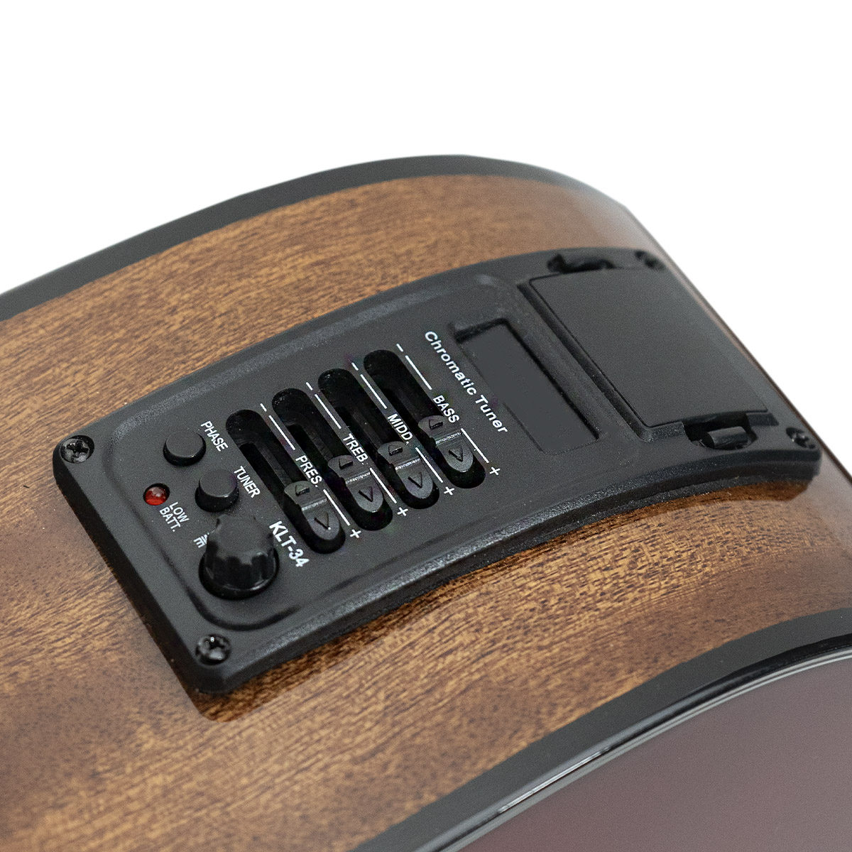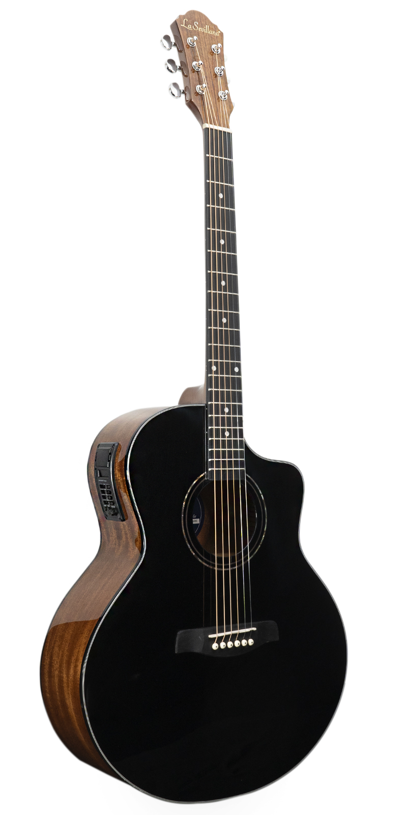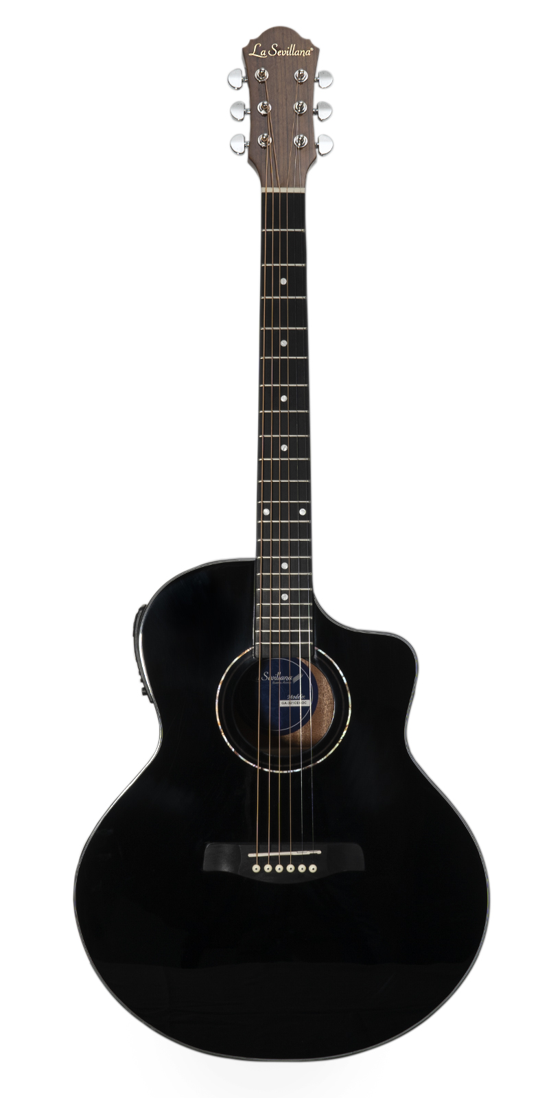 La guitarra electroacústica La Sevillana GA-321CEQ presenta un diseño Grand Auditorium en color negro, equipada con un preamplificador KLT-34 de 4 bandas, con conectividad a través de un jack de 1/4 de pulgada. Cuenta con un cuerpo de sonokeling, tapa de abeto en color negro, diapasón estándar con 20 trastes, y está diseñada para proporcionar un sonido claro y brillante, siendo ideal para músicos de todos los niveles.