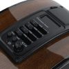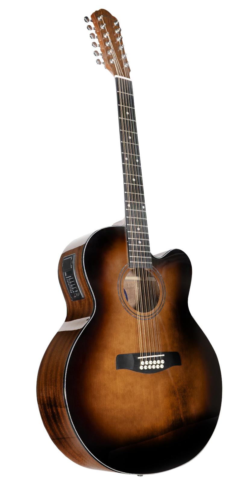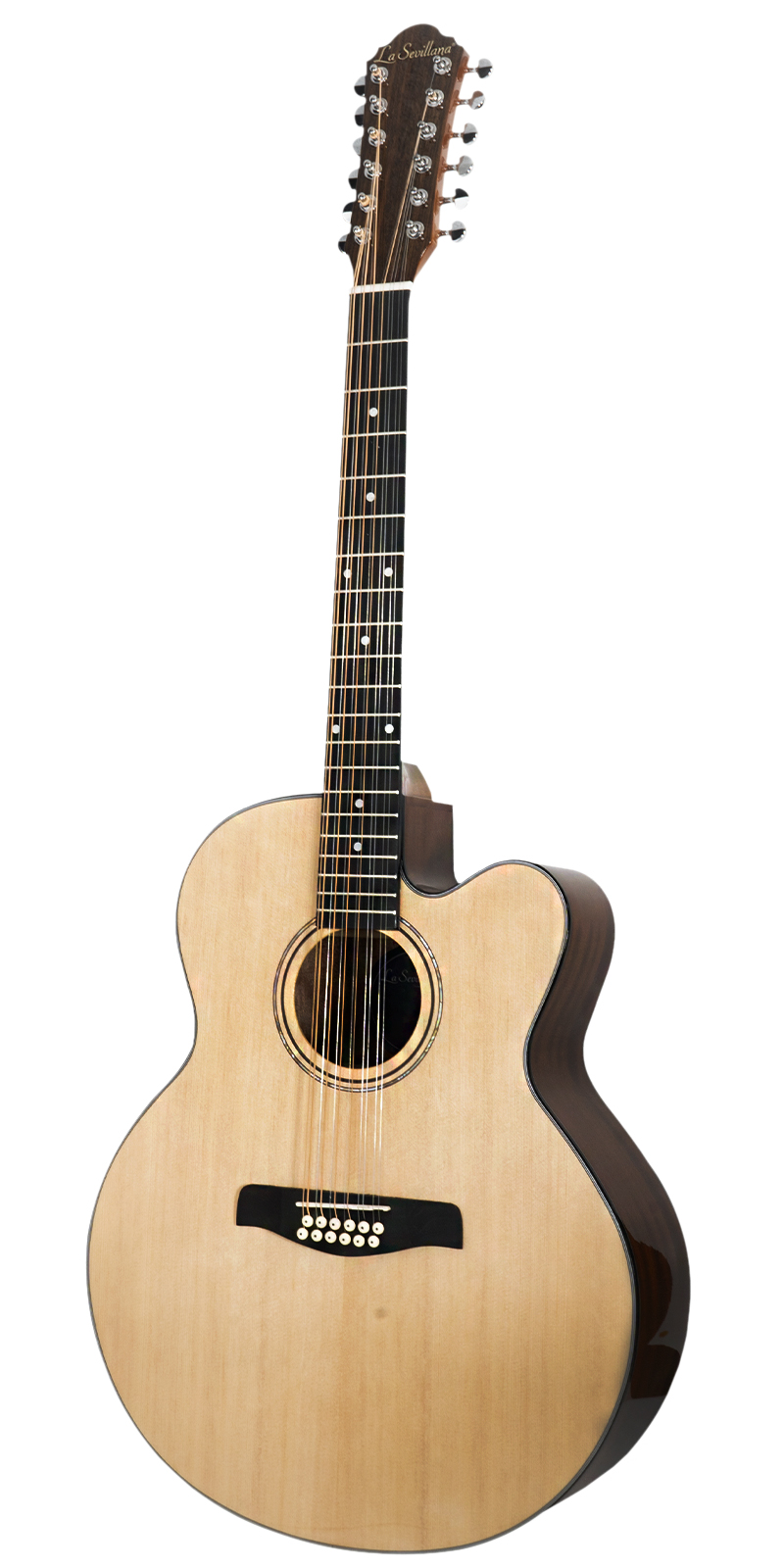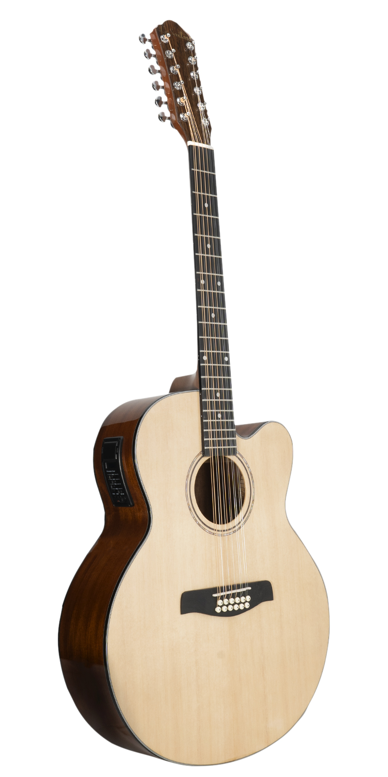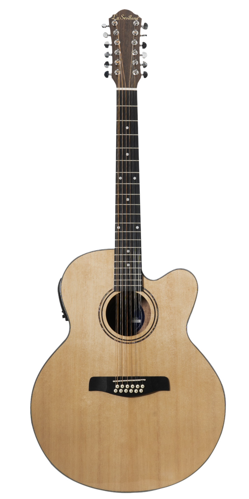 La guitarra electroacústica La Sevillana JU-1200CEQ en color natural presenta un cuerpo Jumbo de 12 cuerdas con aros y fondo de caoba, equipada con un preamplificador activo KLT-34 que incluye un afinador digital, ecualizador de 4 bandas, volumen y fase. Con conectividad a través de plug de 1/4 de pulgada, diapasón de sonokelin y tapa de abeto, esta guitarra ofrece una combinación equilibrada de tonos cálidos y brillantes. Con maquinaria de acero die-cast, 20 trastes y un diseño natural, es una opción ideal para músicos que buscan una guitarra electroacústica de alta calidad.