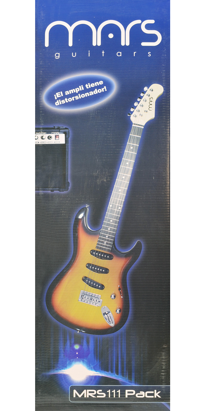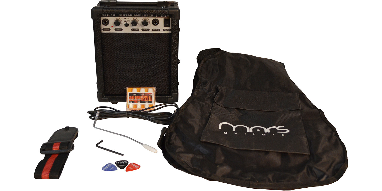 Combo de 10 watts con distorsionador, cable, tahalí, afinador de silbato, plumillas y llaves de ajuste.