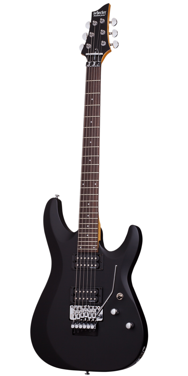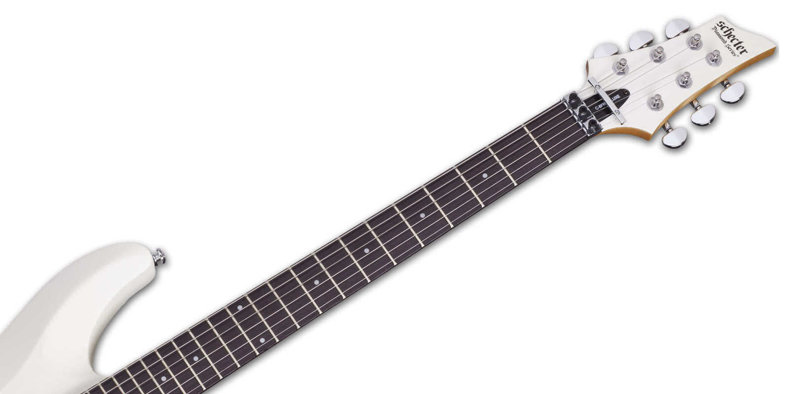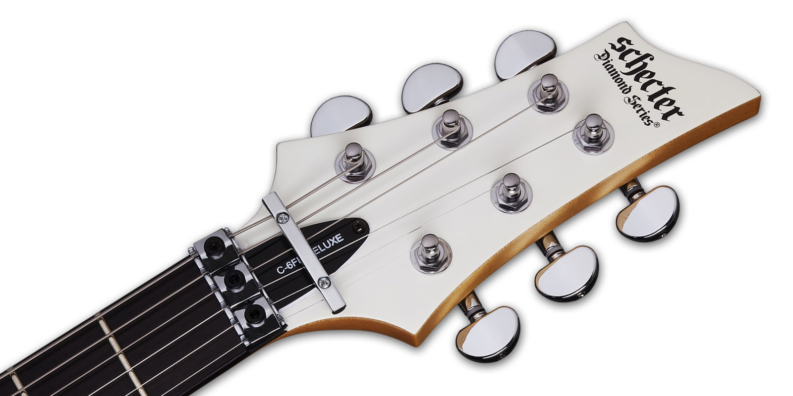 Guitarra Eléctrica SCHECTER C-6 FR DELUXE, sólida, construida con cuerpo de tilo, tapa plana con borde biselado, construcción Bolt on con puente SGR by Floyd Rose, brazo C delgado de maple, diapasón de palo de rosa e incrustaciones de puntos de 4 mm, escala: 25.5” (648 mm), 24 trastes Narrow X-Jumbo, cejuela SGR by Floyd Rose, maquinaria Schecter, alma ajustable de 2 vías, pastilla del puente: Schecter Diamond Plus, pastilla del brazo: Schecter Diamond Plus, controles: Volumen / Tono / Selector de 3 posiciones, hardware cromado, perillas de metal moleteado con tornillo de fijación.