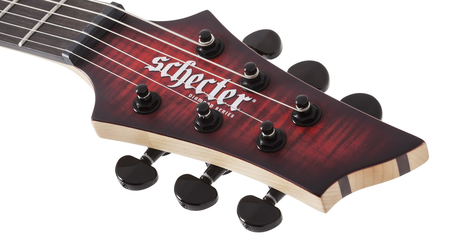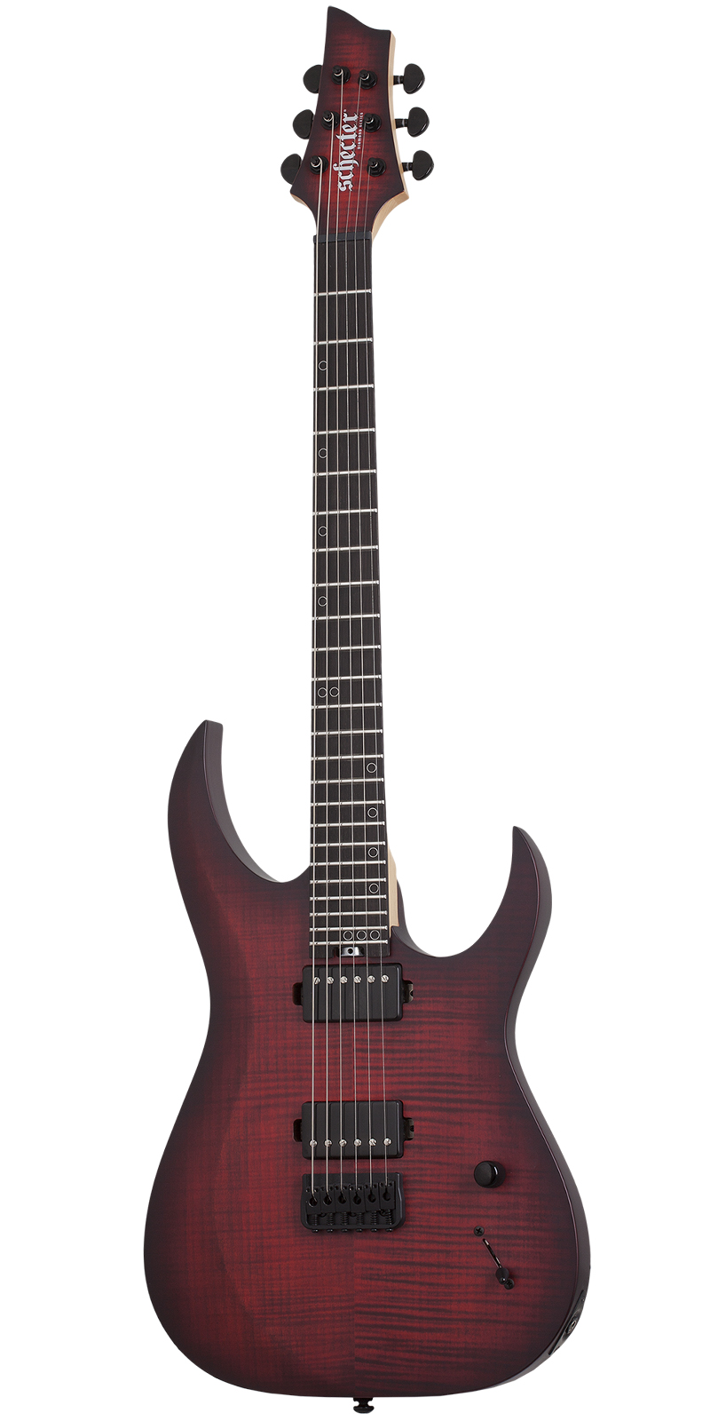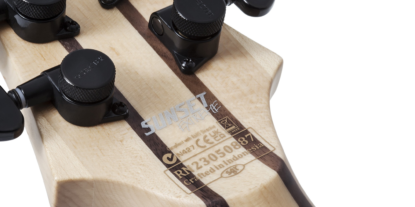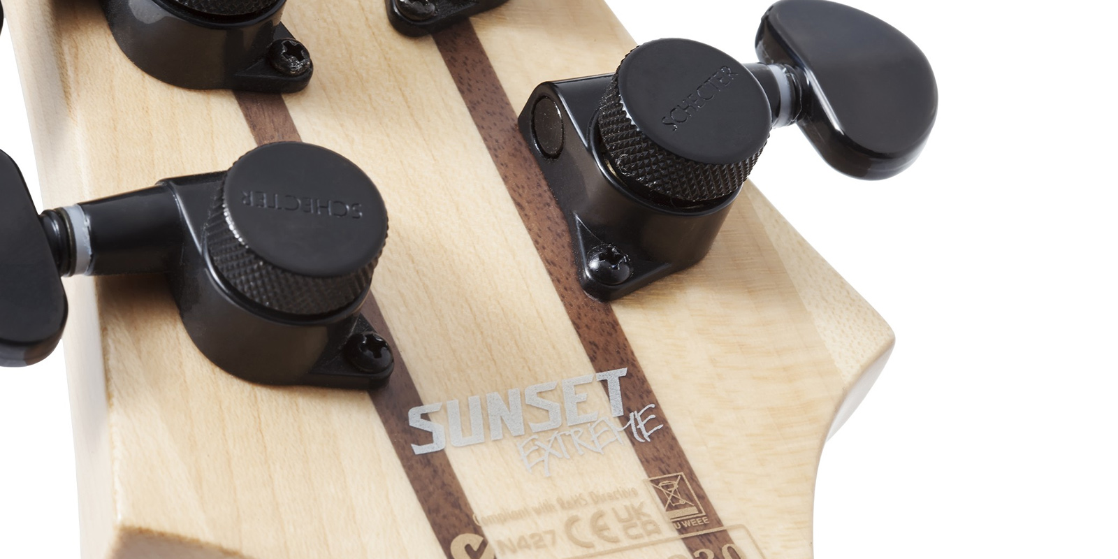 Guitarra Schecter Sunset-6 Extreme construida con cuerpo Nyatoh, mástil de arce y palisandro, diapasón de ébano con diseño de cuello de múltiples capas y perfil del mástil en forma de ”C” ultradelgado y 24 trastes XJ. Escala de 25,5 pulgadas y el radio del diapasón de 16 pulgadas, humbuckers Schecter USA, incluyen un Sunset Strip en el puente y Pasadena en el mástil, diseño de bobina dividida se acompaña de una perilla de volumen única y un selector de 5 posiciones y clavijeros de bloqueo Schecter y el puente Diamond Hardtail Plus están unidos por una tuerca Graph Tech Black TUSQ XL