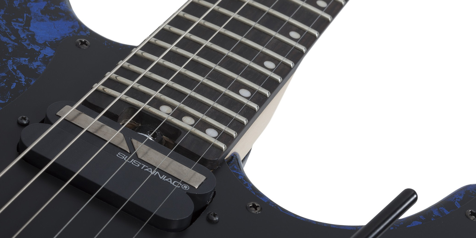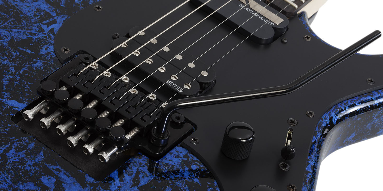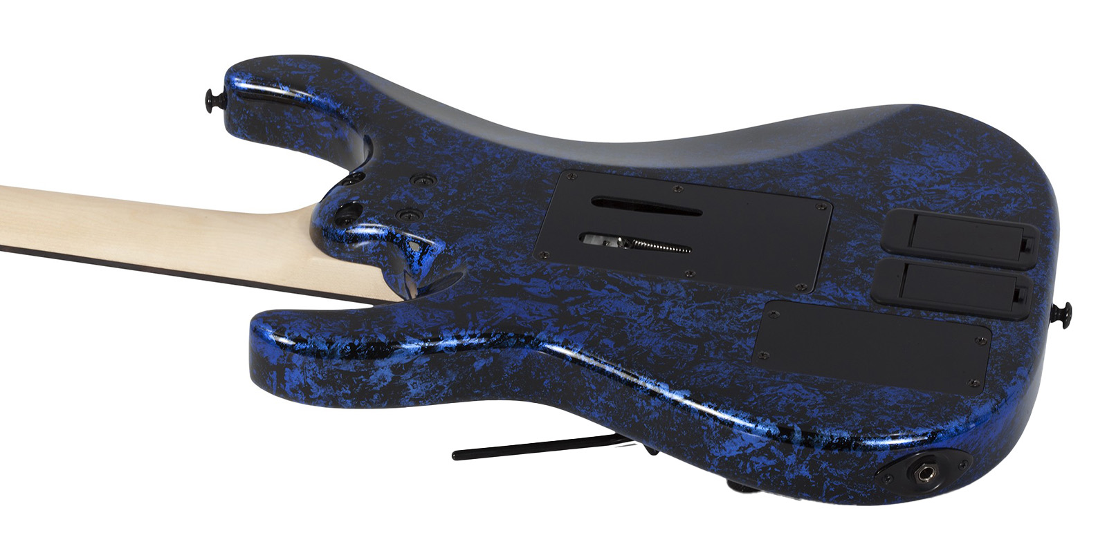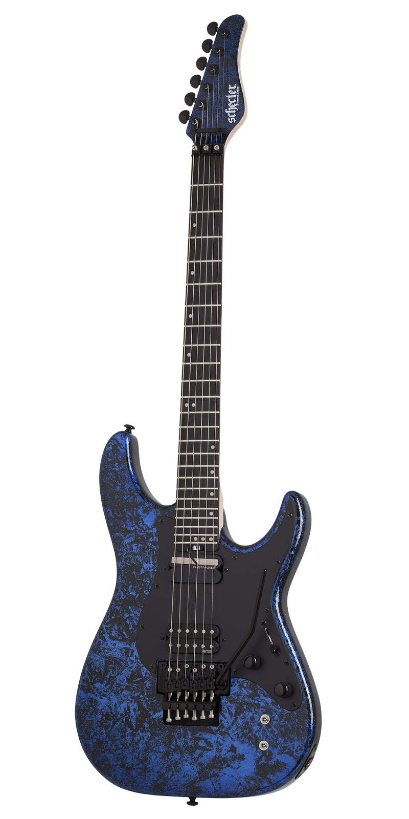 Guitarra Eléctrica Schecter SVSS FR-S color Blue Reign, hardware en color negro, para músicos diestros, Flat top, contorno superior de superficie plana, material del cuerpo de caoba, puente Floyd Rose Special ”hot Rod” Locking tremolo (exclusivo de schecter), material del diapasón de ébano, material del cuello arce de roca canadiense, incrustraciones de puntos desplazados/inversos, con escala de 25,5” (648 mm), espesor del traste 1 de 0,787” (20 mm), traste 12: 0,877” (22 mm), trastes 24 x – jumbo, radio del diapasón 14” (355 mm), tuerca de palo de rosa, nut width de 1.625” (41.3 mm), truss Rod de varilla ajustable de 2 vías con rueda de radios de acceso de talón. Color de hardware negro. Controles de Volumen/tono/interruptor de 3 vías (captura)/ Interruptor sustain de encendido-apagado de 2 vías/ interruptor de modo sustain de 3 vías (Fundamental mix – Harmonic), pastilla del puente EMG Retro Active HOT 70, Neck pickup Sustainiac, compartimento de bateria double 9 -volt Clip-in, cuenta con accesorios Knobs Metal knurled w/ set screw, cuerdas Ernie ball hybrid slinky #2222 (.009-.046)