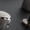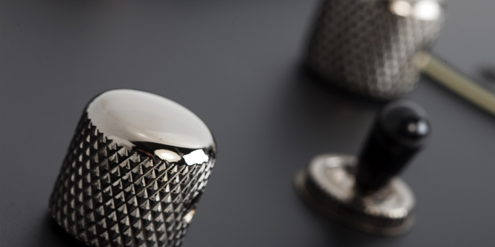 Perillas de metal moleteado con tornillo de ajuste.