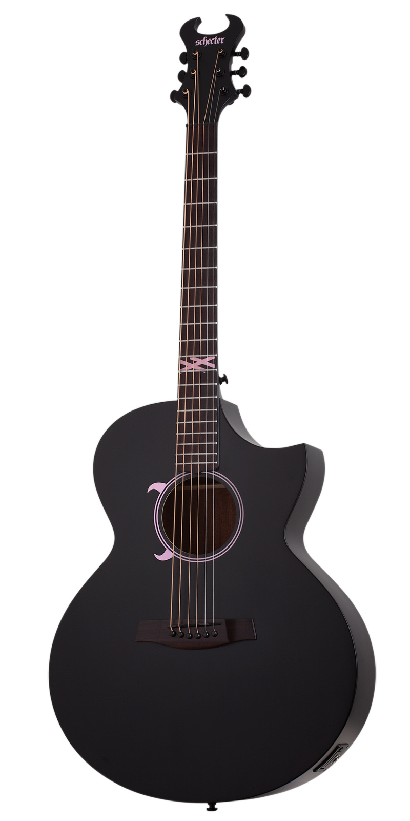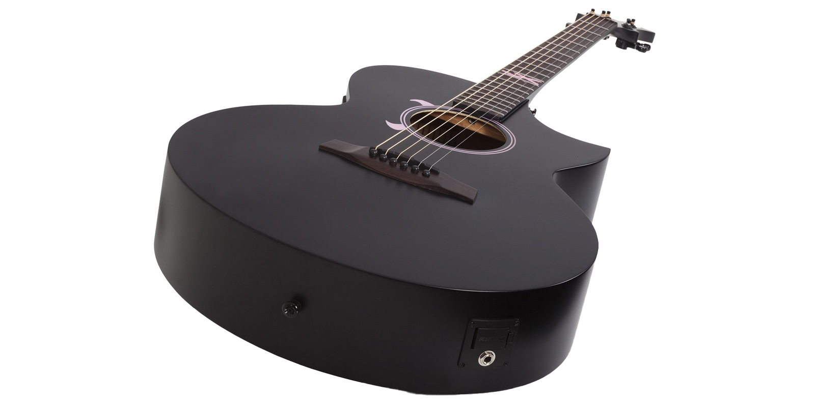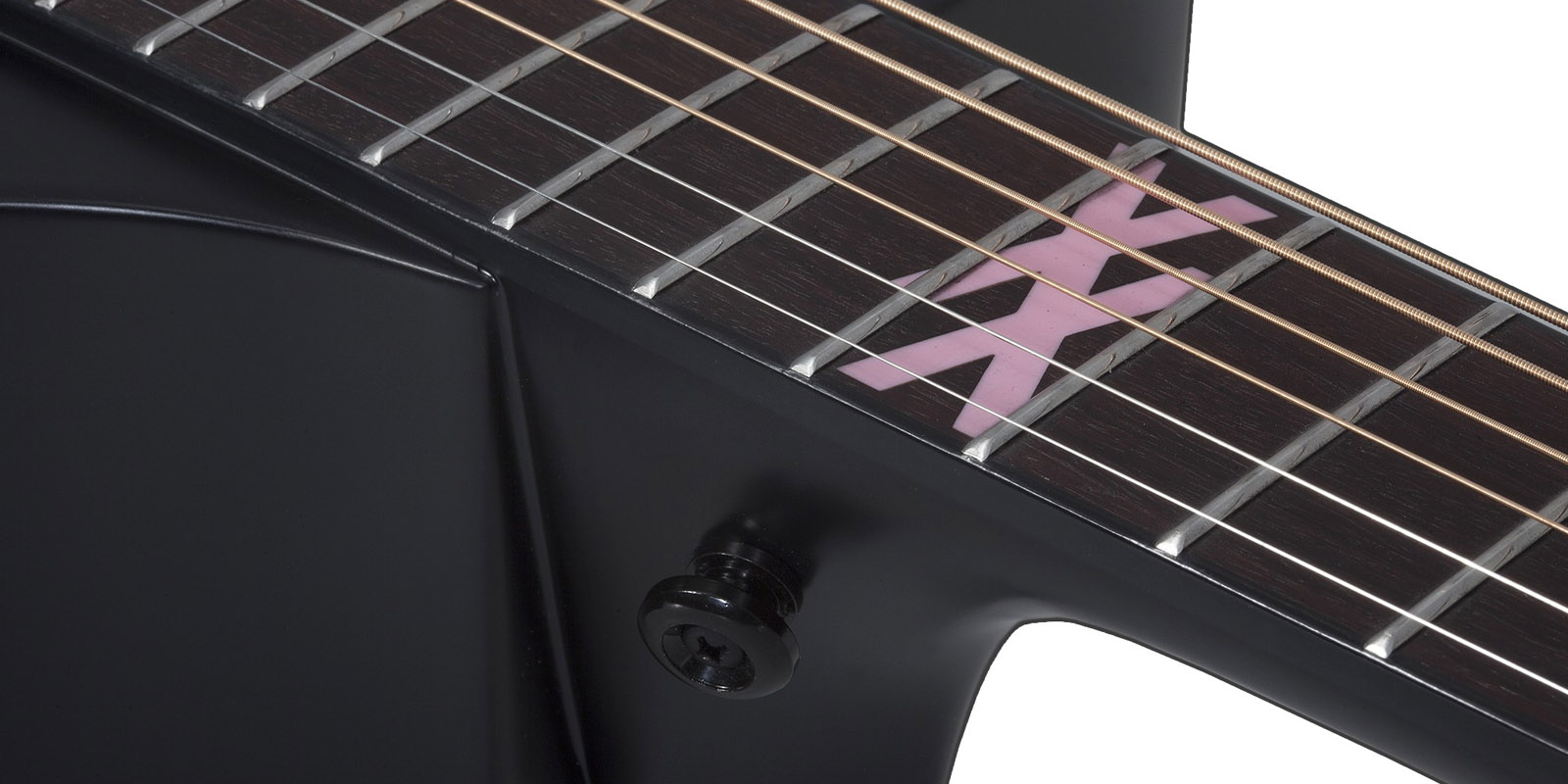 Guitarra electroacústica Machine Gun Kelly diseñada con material de diapasón de palisandro, y arce de roca dura en el mástil con incrustraciones Hot Pink Double XX y marcadores de puntos laterales de puntos rosas. Escala de 25.5 ” y forma de mástil ”c” delgada. 20 trastes estándar y nut Graph Tech XL Black Tusq. Color negro satinado con hardware en color negro con material de caoba laminada. Pasilla del puente Fishman Sonicore. Cuerdas Ernie ball Everlast Coated Acoustic (.012-.054)