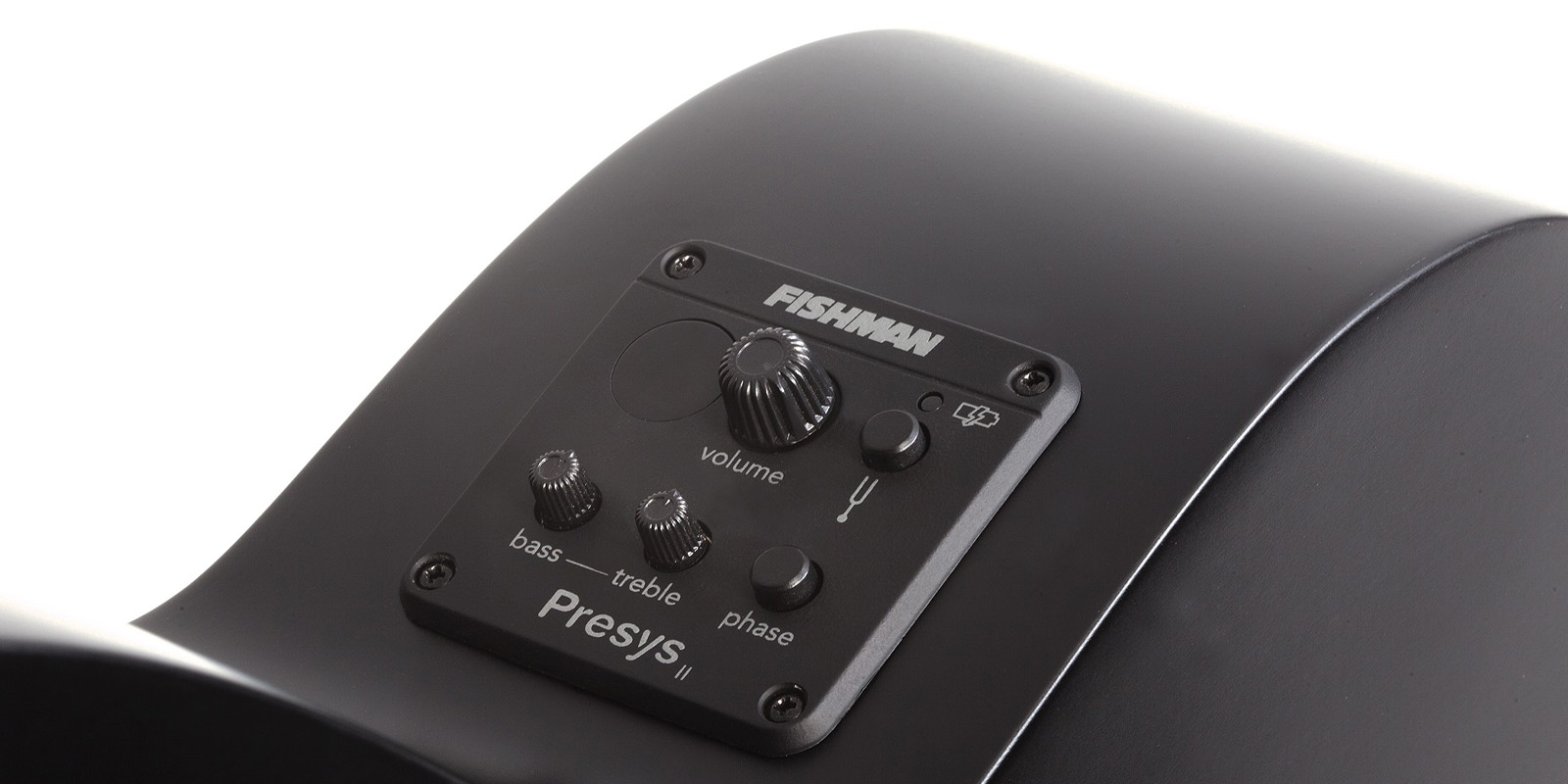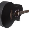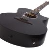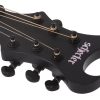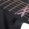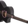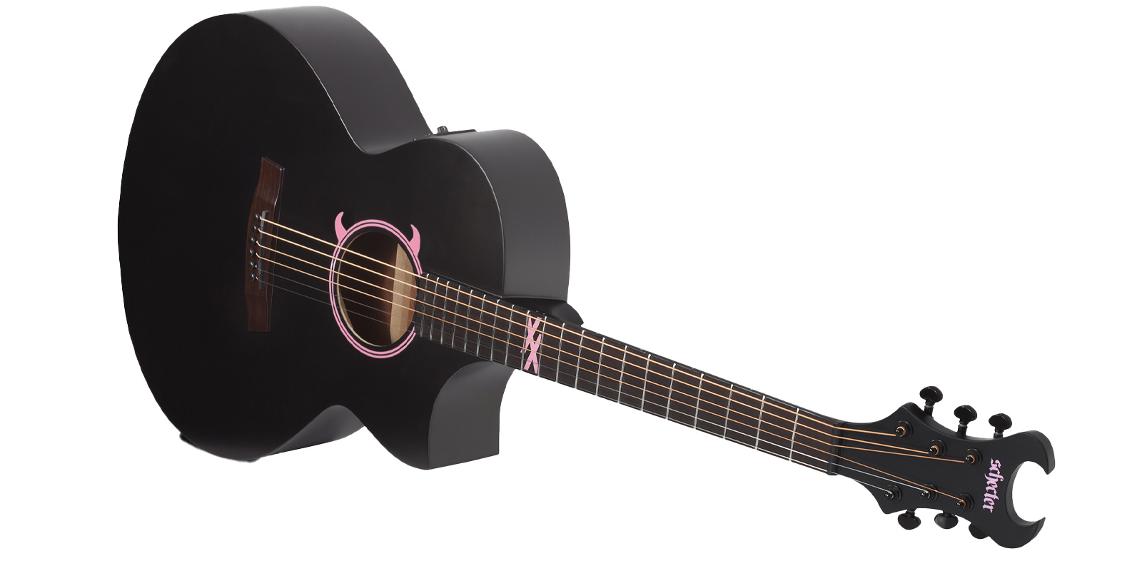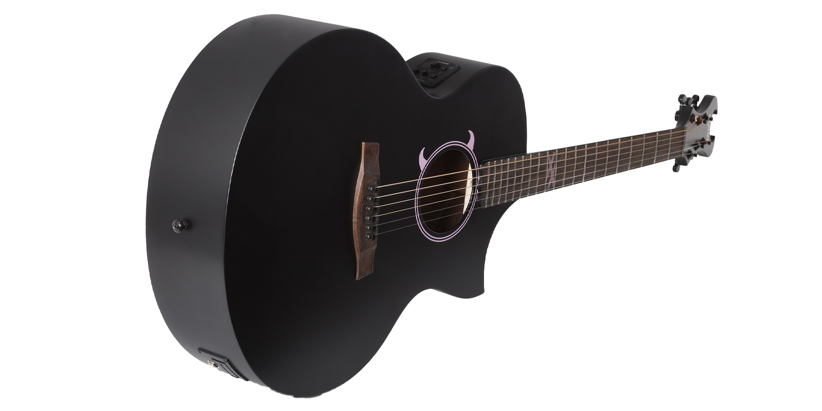 Guitarra electroacústica Machine Gun Kelly diseñada con material de diapasón de palisandro, y arce de roca dura en el mástil con incrustraciones Hot Pink Double XX y marcadores de puntos laterales de puntos rosas. Escala de 25.5 ” y forma de mástil ”c” delgada. 20 trastes estándar y nut Graph Tech XL Black Tusq. Color negro satinado con hardware en color negro con material de caoba laminada. Pasilla del puente Fishman Sonicore. Cuerdas Ernie ball Everlast Coated Acoustic (.012-.054)