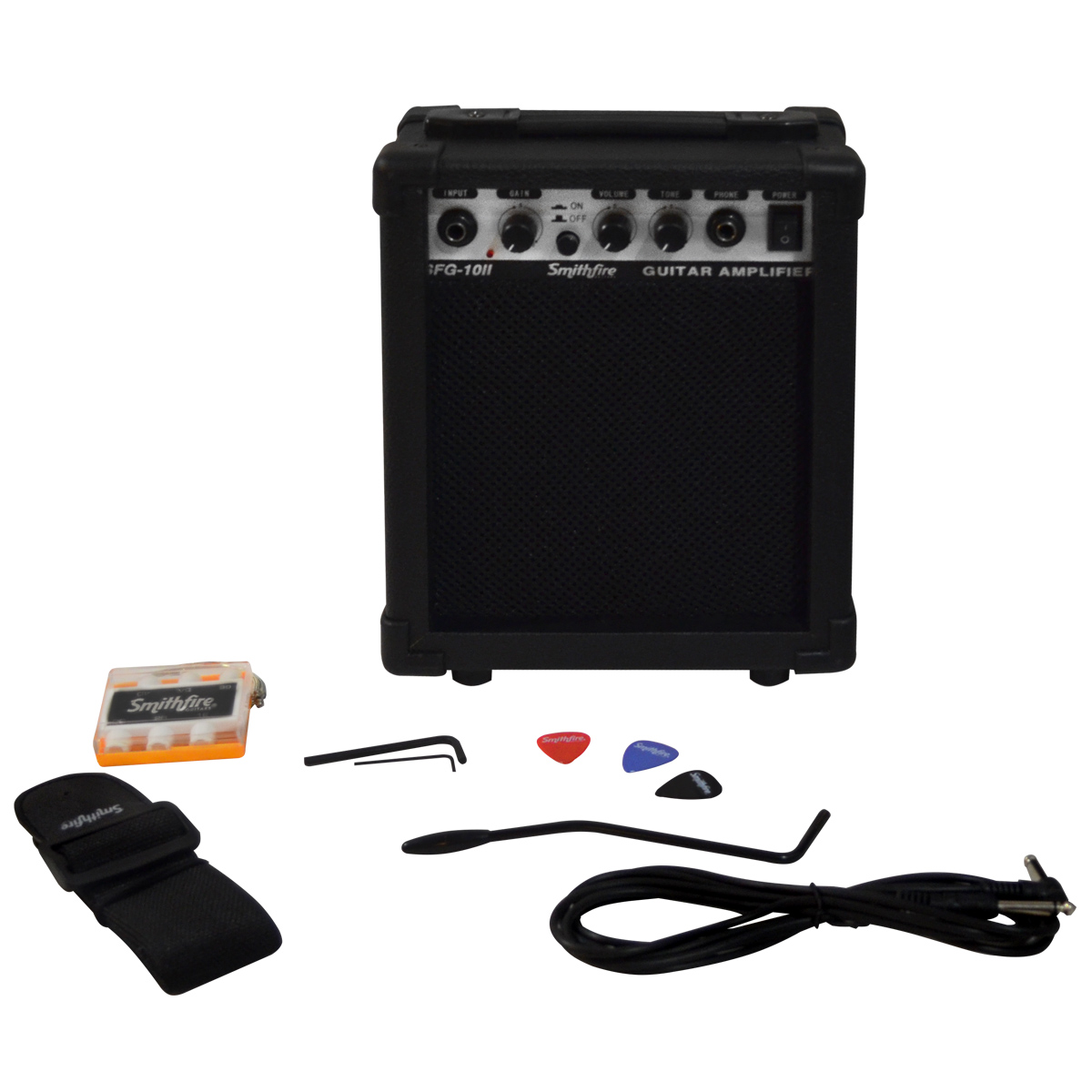 Combo de 10 watts con distorsionador, cable, tahalí, afinador de silbato, plumillas y llaves de ajuste.