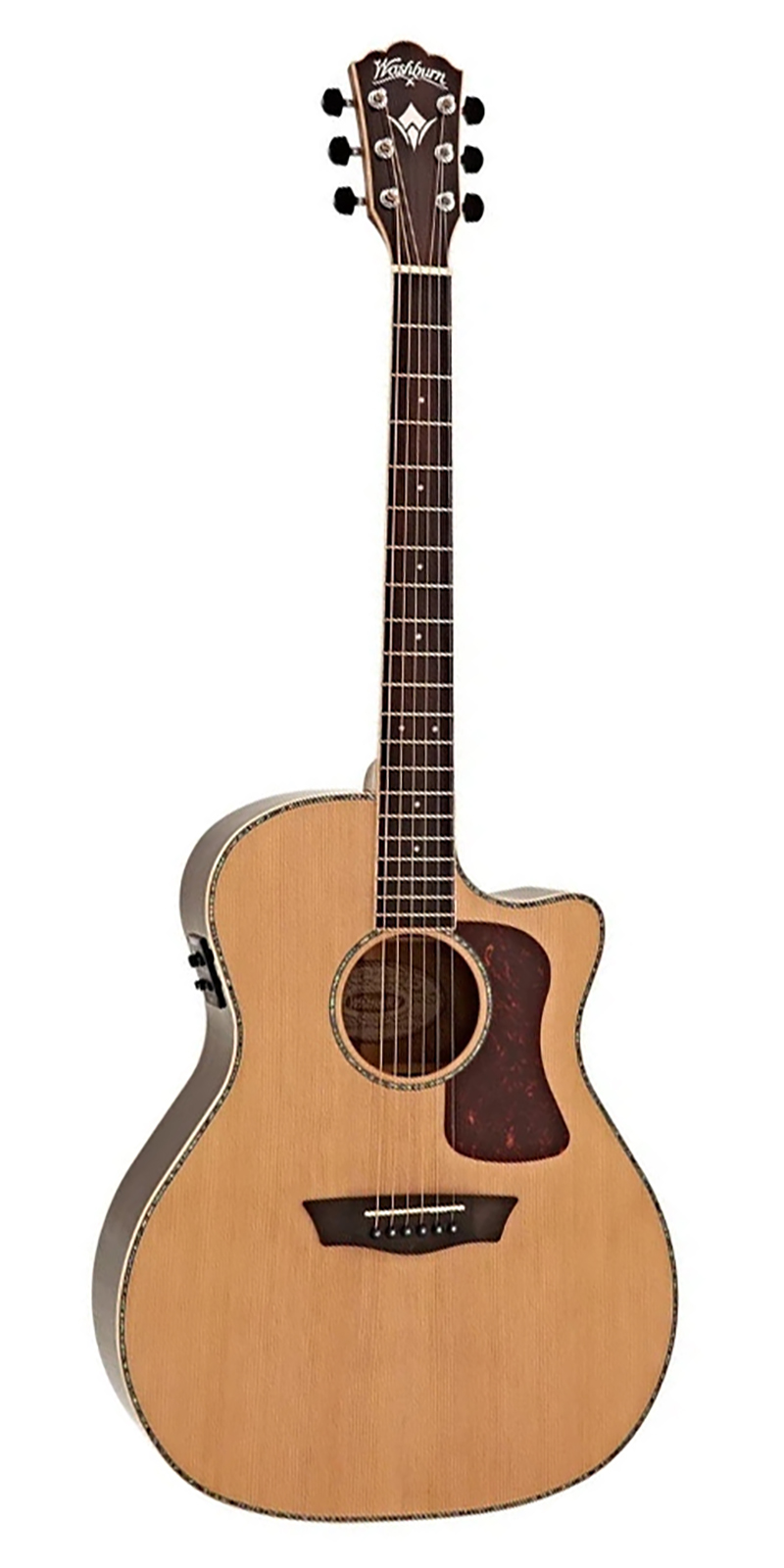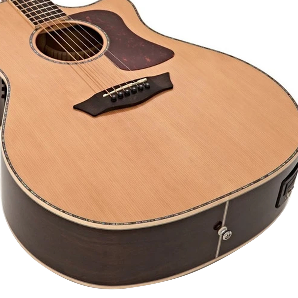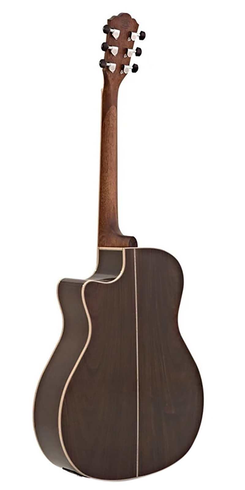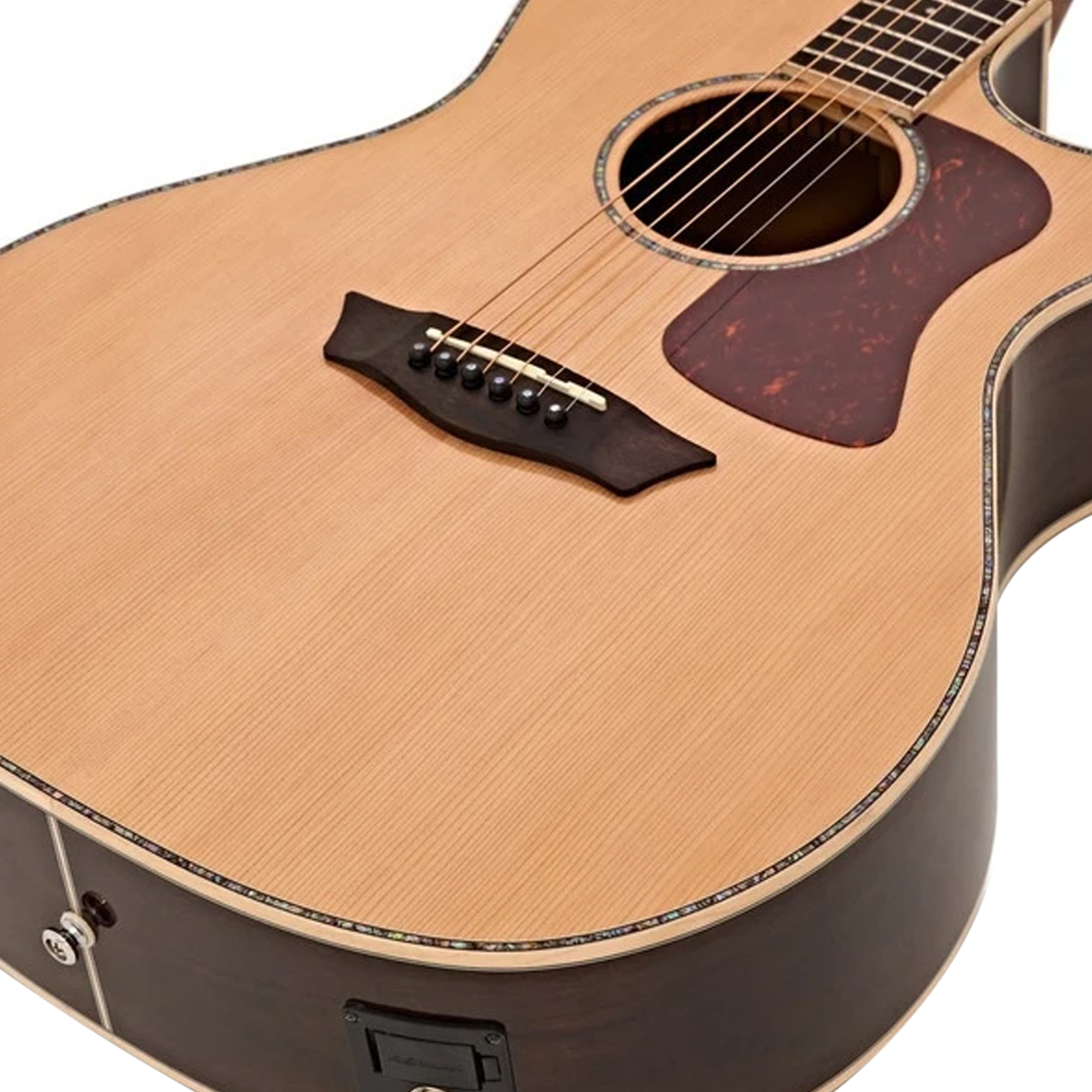 Cuerpo de cedro rojo sólido occidental.Aros y fondo de pau ferro.Refuerzo Cathedral Peaked Scalloped-X.Roseta: Abalone.Tipo: Acústica.Forma: Grand Auditorium.Estilo: 6 cuerdas, cutaway.