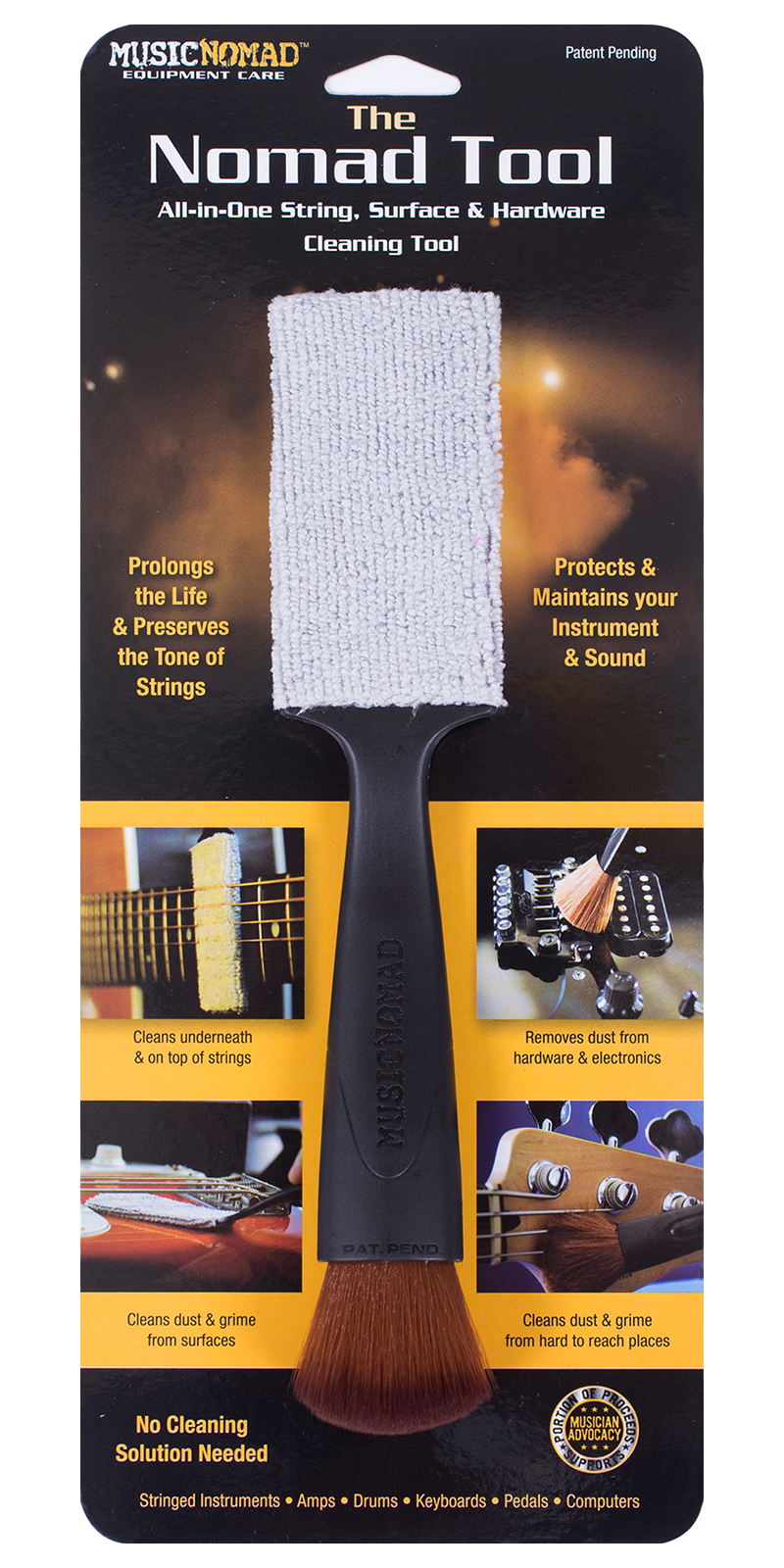 Almohadilla de limpieza, ideal para hardware y cuerpo en cualquier instrumento acústico, eléctrico, mezcladora, pedales, entre otros, diseño patentado e innovador, almohadilla de microfibra lavable de primera calidad, limpia la parte superior y por debajo de las cuerdas en cuestión de segundos, almohadilla 100% sin pelusa, limpia rápidamente el polvo, la suciedad y las huellas dactilares en instrumentos y las áreas difíciles de alcanzar, puedes utilizar las suaves fibras naturales como un cepillo limpiador para quitar acumulación de polvo en el cuerpo, el puente, cejuelas, maquinaria, cabezal y todo lo demás, diseño ergonómico.
