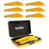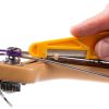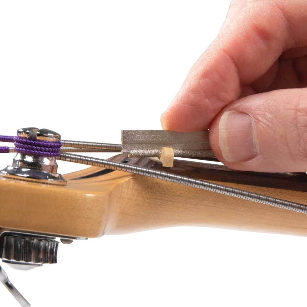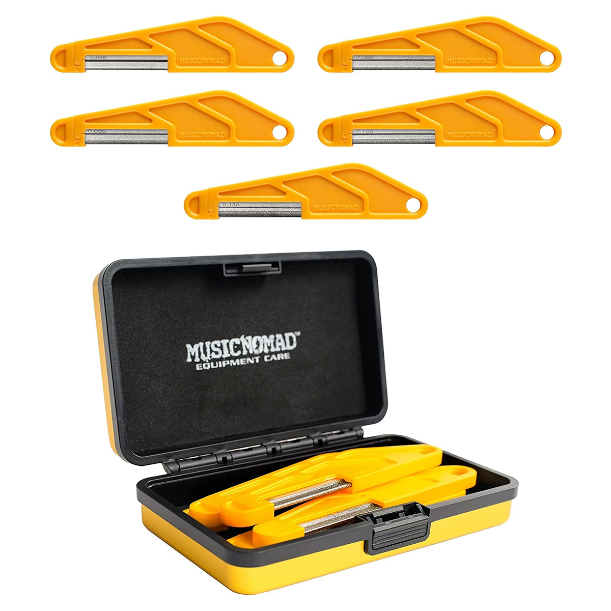 Set de limas para bajo eléctrico de 5 cuerdas (.046”, .065”, .085”, .105”, .130”) con revestimiento de diamante de resistencia industrial, viene en caja de aluminio compacta, liviana y fuerte de 3” x 6” x 1.4”, innovador diseño de hoja redonda en forma de cuerda que no se dobla, lo que da como resultado cortes suaves y precisos, tamaño grabado con láser en cada hoja más mango ergonómico y práctico orificio para colgar en el banco de trabajo, perfecto para cortar y pulir al mismo tiempo ranuras para tuercas nuevas o existentes, ideal para todos los materiales de cejuela más comunes como nylon, hueso, grafito y TUSQ, incluso funcionan de maravilla en monturas.