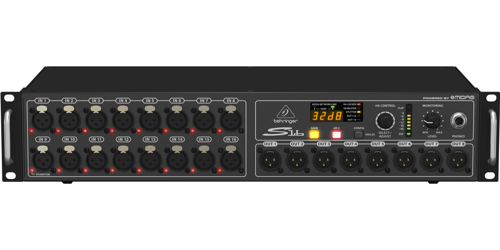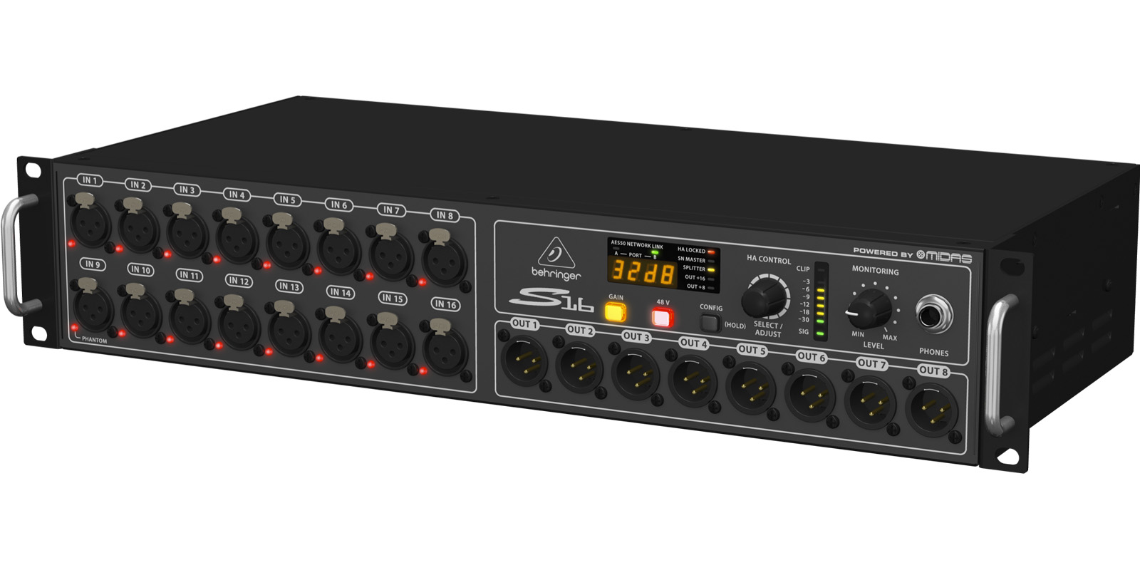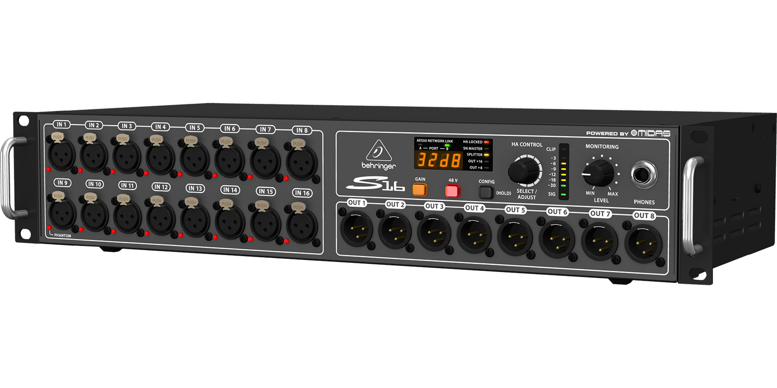 Entradas XLR, preamps MIDAS programables: 16.Salidas XLR: 8.Salida phones, TRS 1/4″: 1 (mono).Puertos AES50, SuperMAC: 2.Conector P-16 Ultranet (no requiere fuente de alimentación): 1.E/S MIDI: 1/1.Salidas ADAT Toslink (1x 8 canales): 2.Conector USB tipo B en panel trasero: 1.