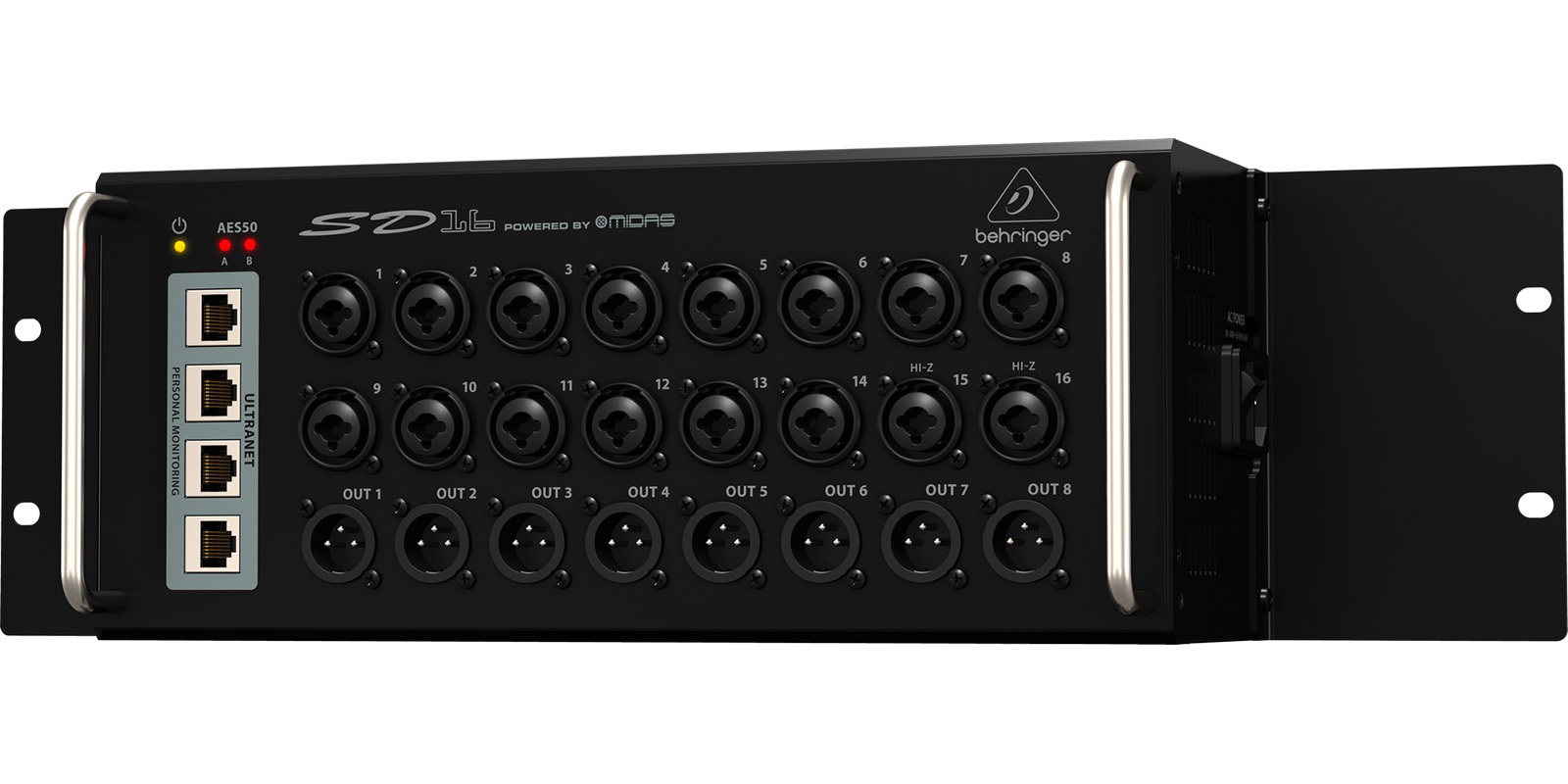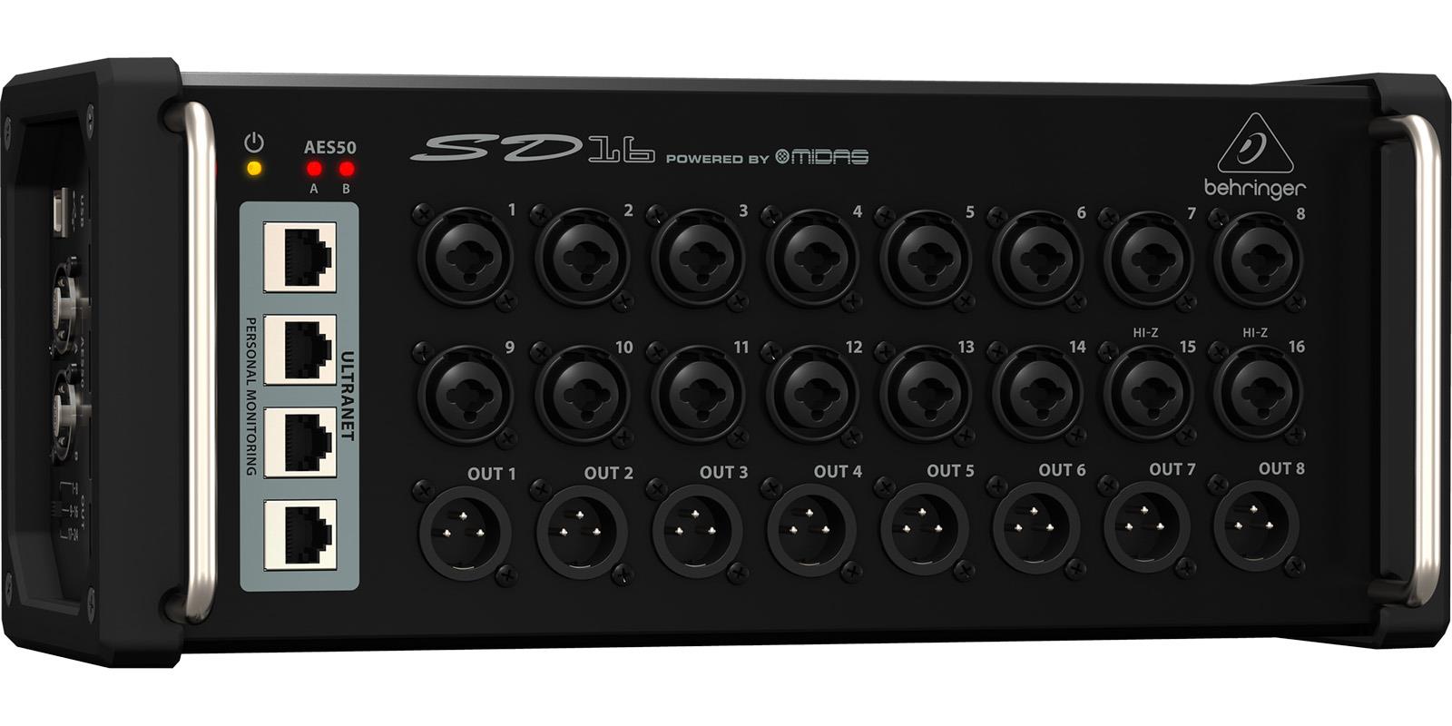 Preamps de micrófono programables, diseñados por MIDAS, combo XLR/TRS balanceado: 16.Salidas de línea, XLR balanceado: 8.Salidas ULTRANET RJ45 (fuente de alimentación para mezcladoras personales Behringer P16-M): 4.Red AES50 SuperMac, Neutrik EtherCON: 2.Puerto USB para actualizaciones del sistema, tipo B: 1.