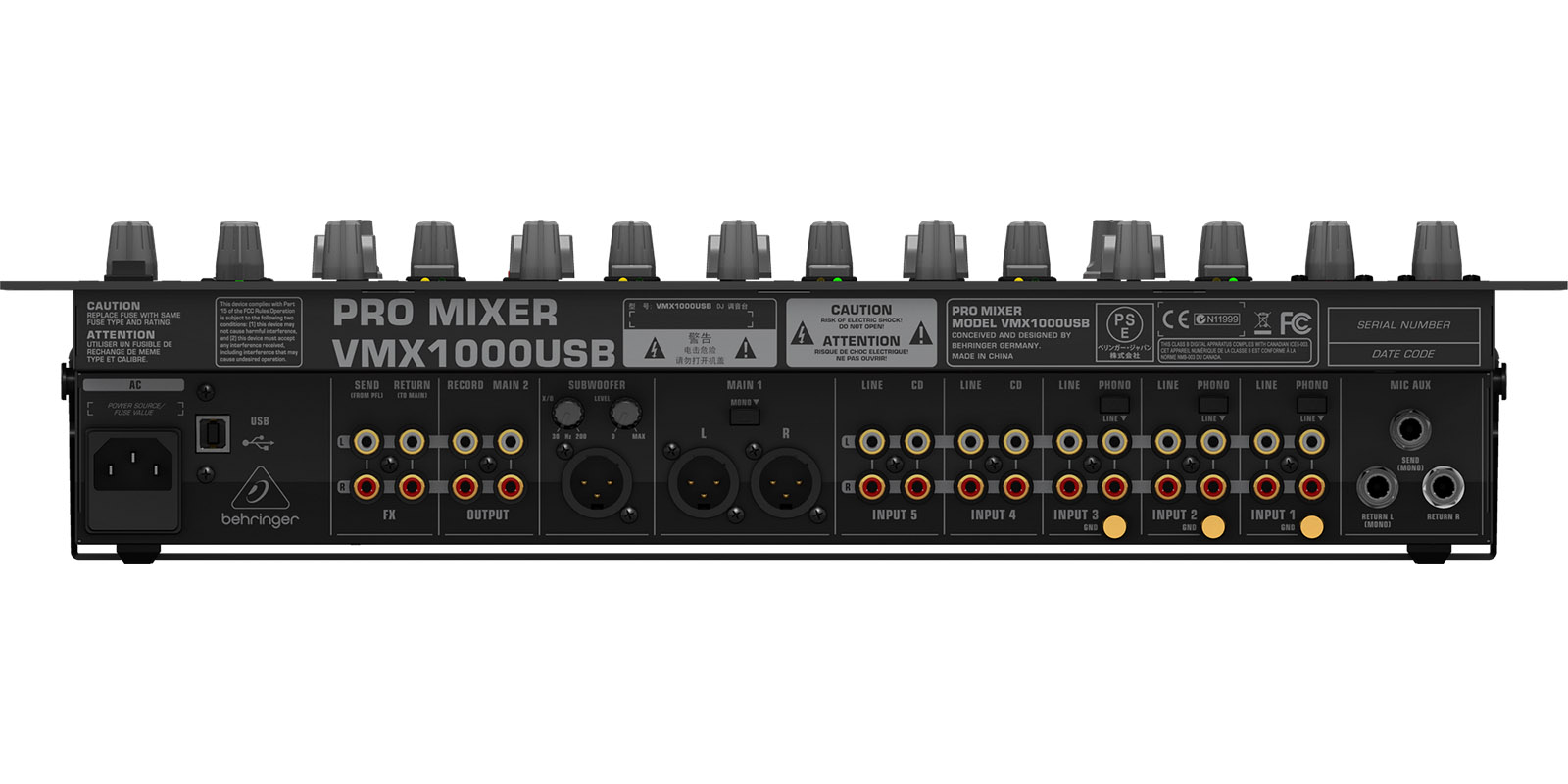 Mic IN: XLR balanceado, 40 dB ganancia.Phono In: RCA desbalanceado, 40 dB ganancia.Line In: RCA desbalanceado, 0 dB ganancia.Retorno: RCA desbalanceado, 0 dB ganancia,Retorno Aux Mic: 1/4″ desbalanceado, 3 dB ganancia.