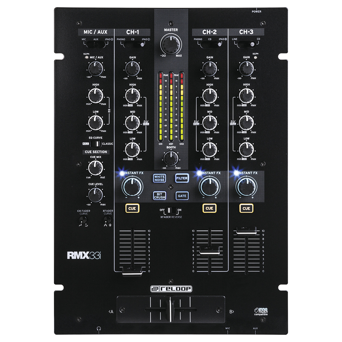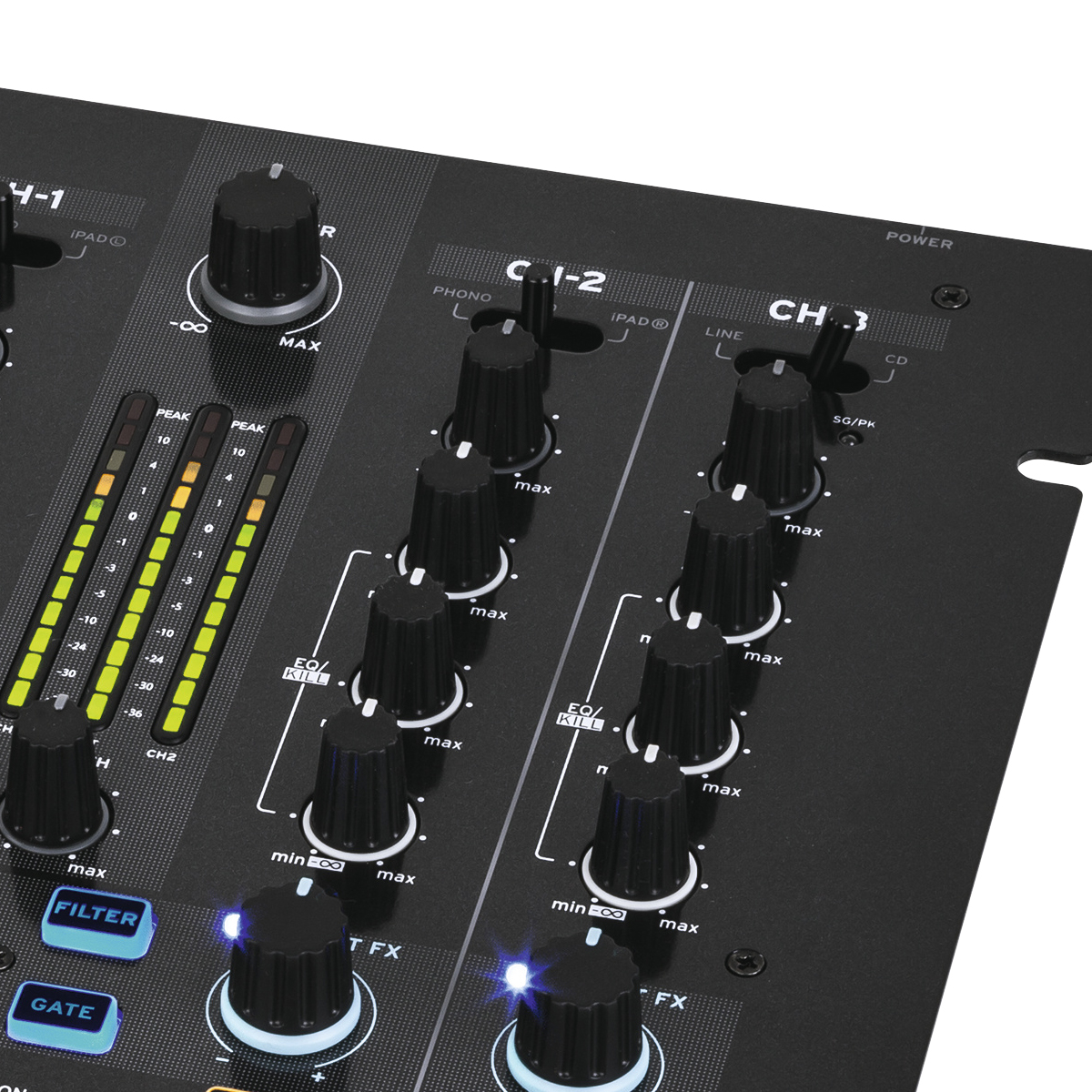 Mezcladora de efectos digitales de 3 + 1 canales.Arquitectura totalmente digital.4 efectos de color de sonido instantáneos por canal (Filtro, Ruido blanco, Bit Crush y Gate).Entrada dividida para iPad, tablet o smartphone.Ajuste de ecualizador para clásico o aislador (kill).Línea de club de 45 mm y crossfader, compatible con innofader.Canal de micrófono con ecualizador de 2 bandas y talkover automático.