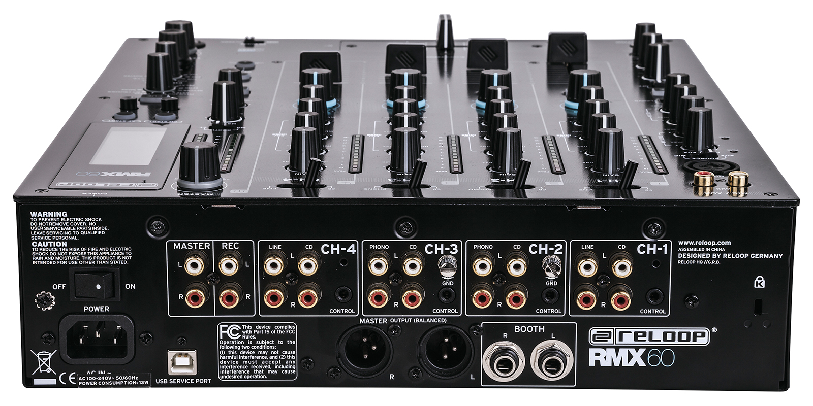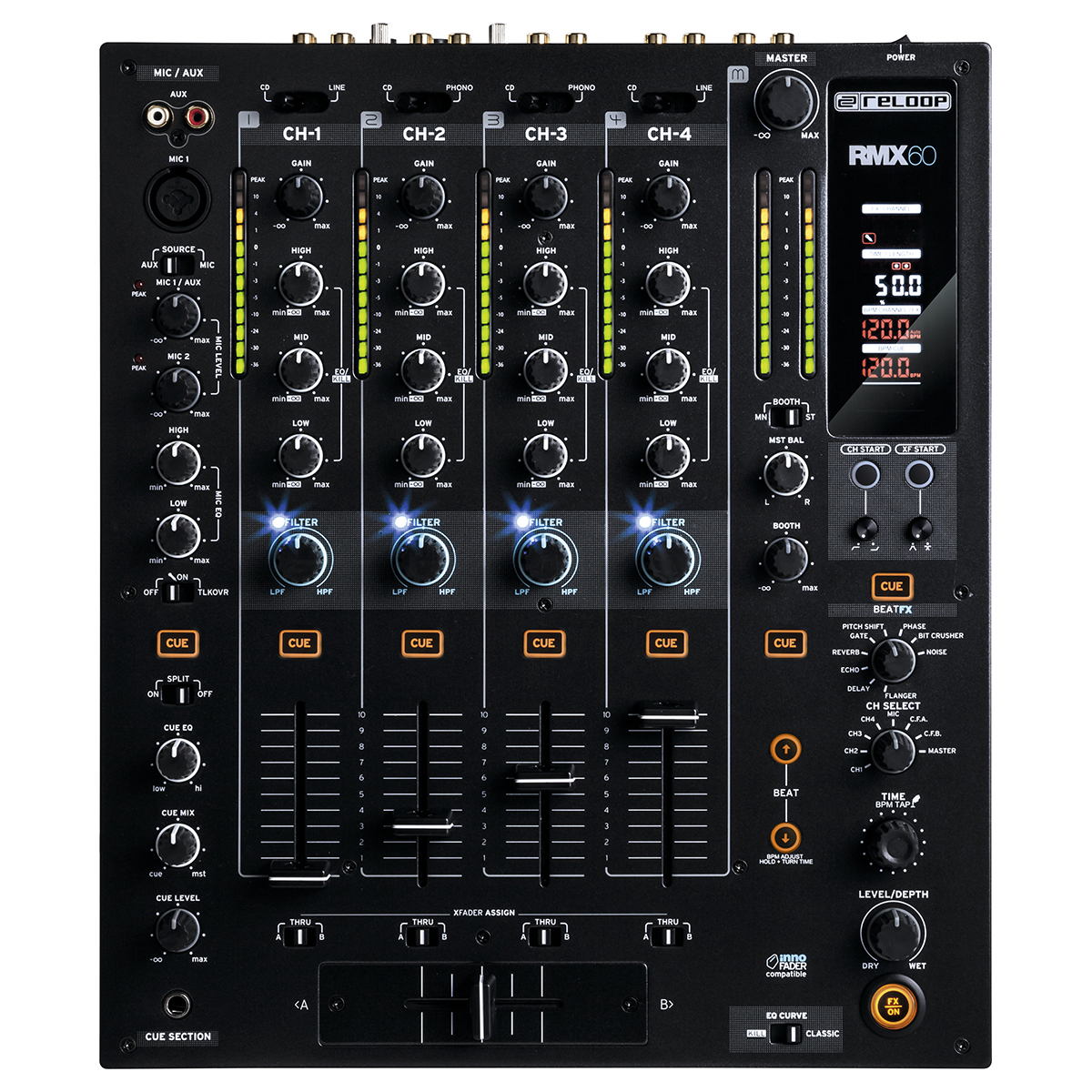 Mezcladora de club de alto rendimiento de 4 + 1 canales.11 entradas y 6 salidas.Arquitectura totalmente digital.8 efectos de alta calidad de estudio (flanger, delay, echo, reverb, gate, pitch shift, phase, bit crusher, noise).Pantalla de parámetros grande y claramente organizada.Filtro bipolar por canal.Características de ecualización ajustables (kill & classic).InnoFader compatible (RMX InnoFader disponible por separado).Switch de asignación de crossfader por canal.Canal de micrófono con ecualizador de 2 bandas y talkover ‘Tecnología Active Ducking’ para canal de micrófono.Ecualizador inteligente de una perilla y switch mono/estéreo para audífonos.Sistema de firmware actualizable (puerto de servicio USB).Fader y crossfader-inicio y ajuste de curva.Salidas simétricas (XLR) y asimétricas (RCA).