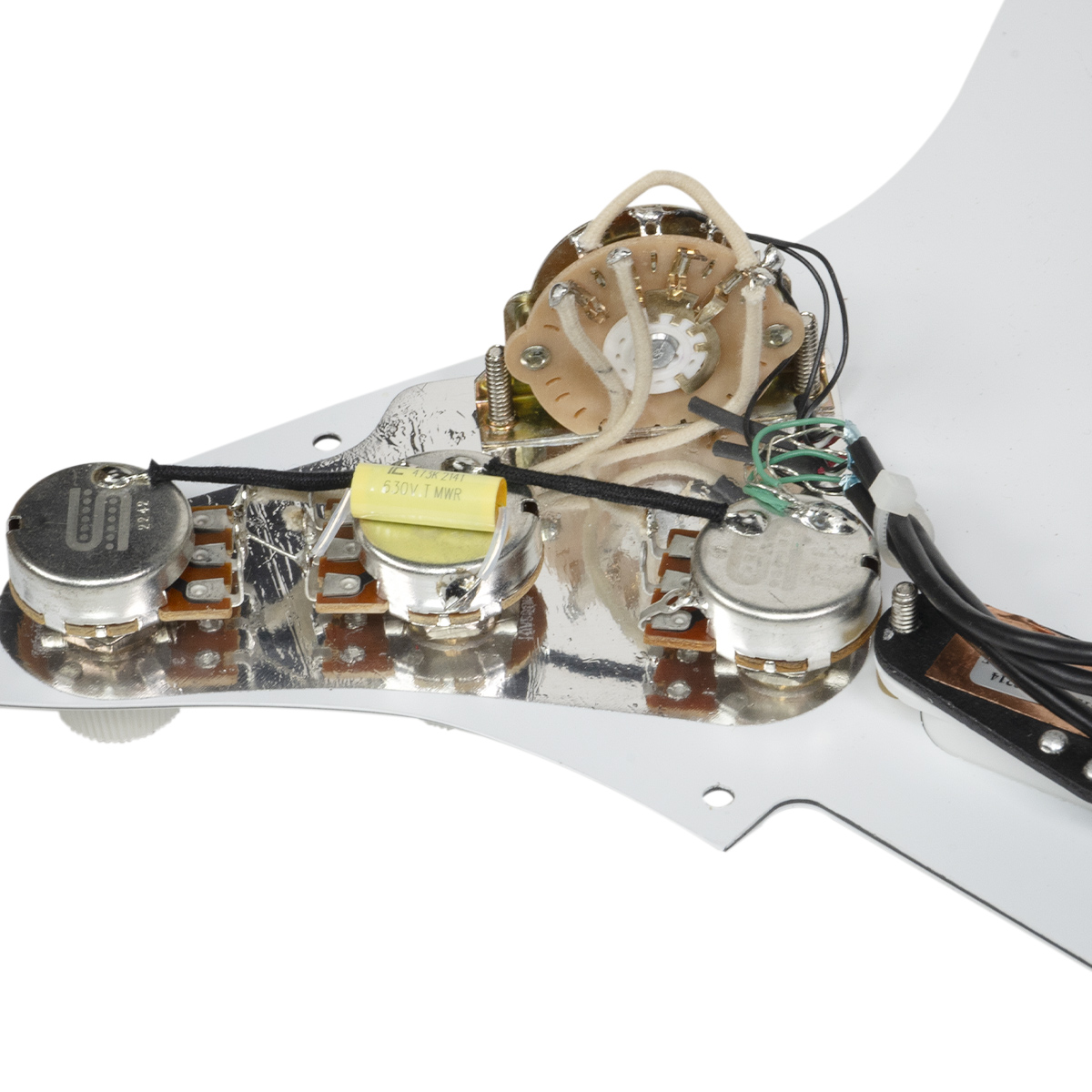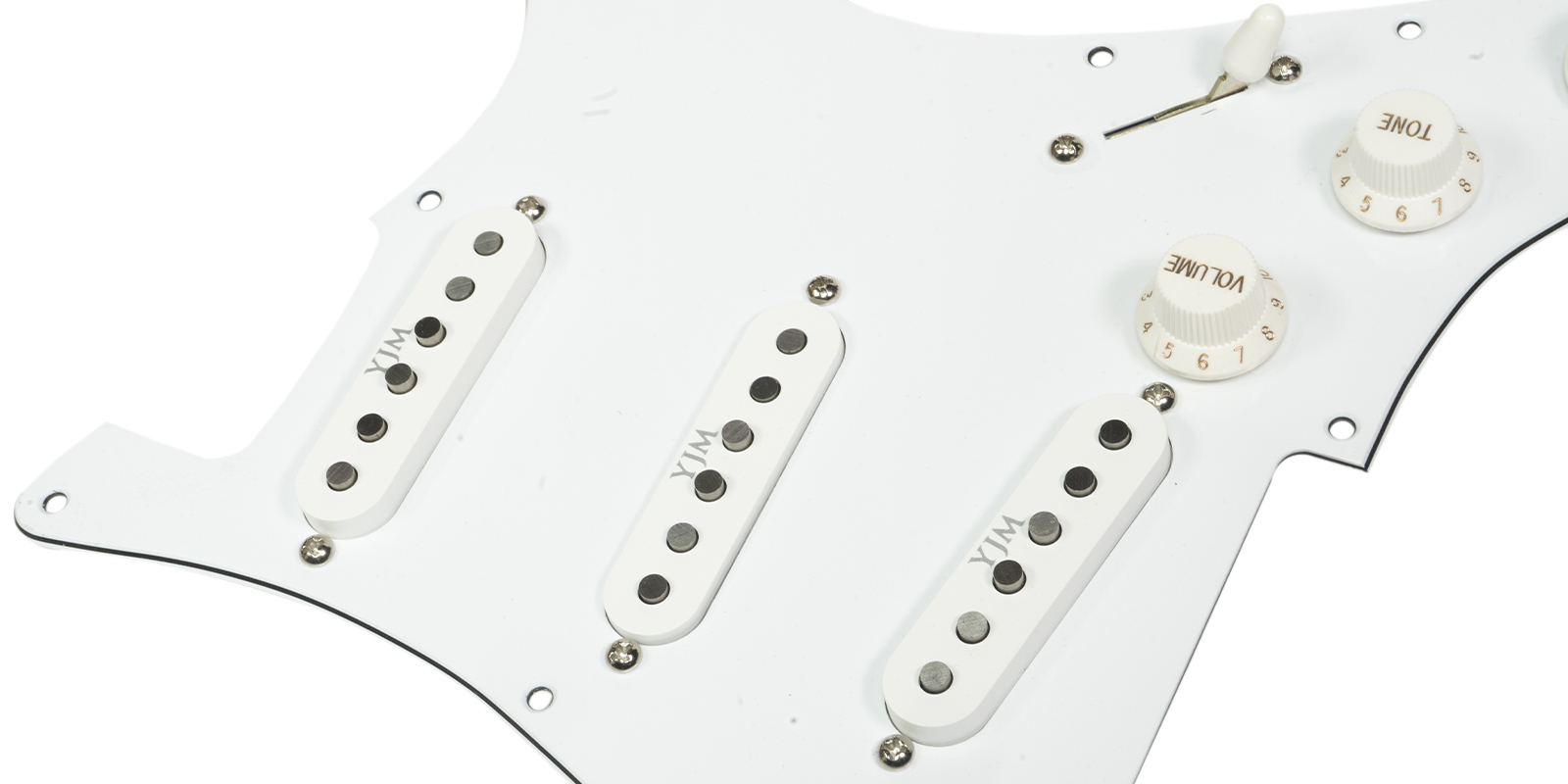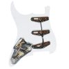Mica con pastillas para guitarra eléctrica, corte americano Strato de 11 agujeros para tornillos, incluye un set calibrado de pastillas YJM Fury y potenciómetro de volumen, posiciones: puente, central y brazo, imán: alnico 5, cable de 4 conductores, blindado, tipo: pasivo, resistencia brazo: 25.50 kilo-ohms, resistencia centro: 25.50 kilo-ohms, resistencia puente: 25.50 kilo-ohms, esta mica de Stratocaster totalmente cargada fue diseñada por el mismo Yngwie para garantizar que con esta configuración tu Stratocaster ofrezca The Fury.