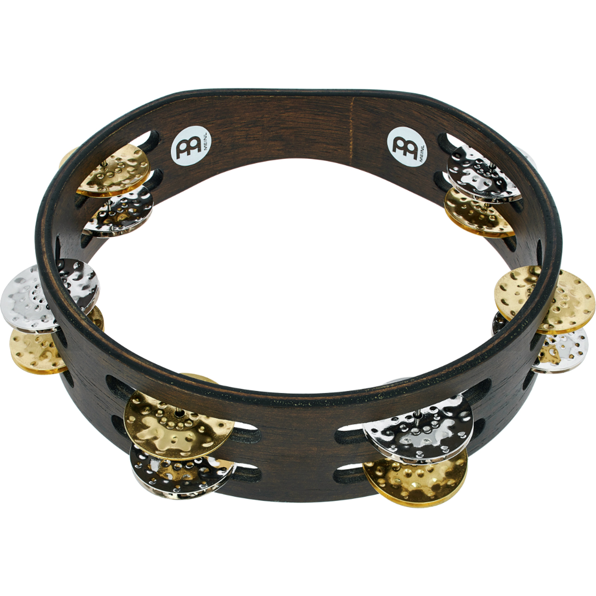 Pandero compacto, diámetro de 8” pulgadas, marco de madera, 2 filas con 6 pares de crótalos de latón martillado y 6 pares de crótalos de acero, ideal para cualquier aplicación en vivo o en estudio.
